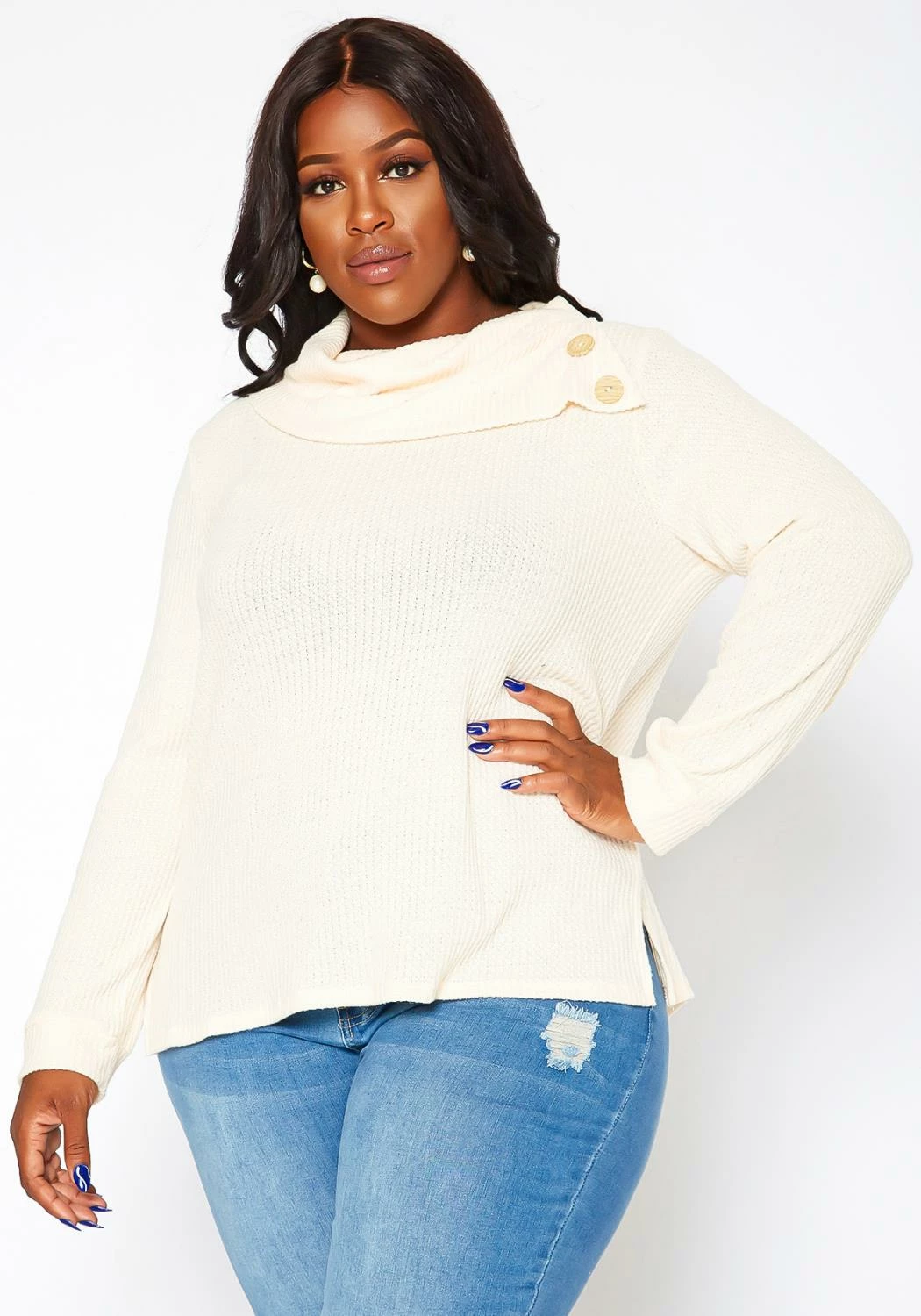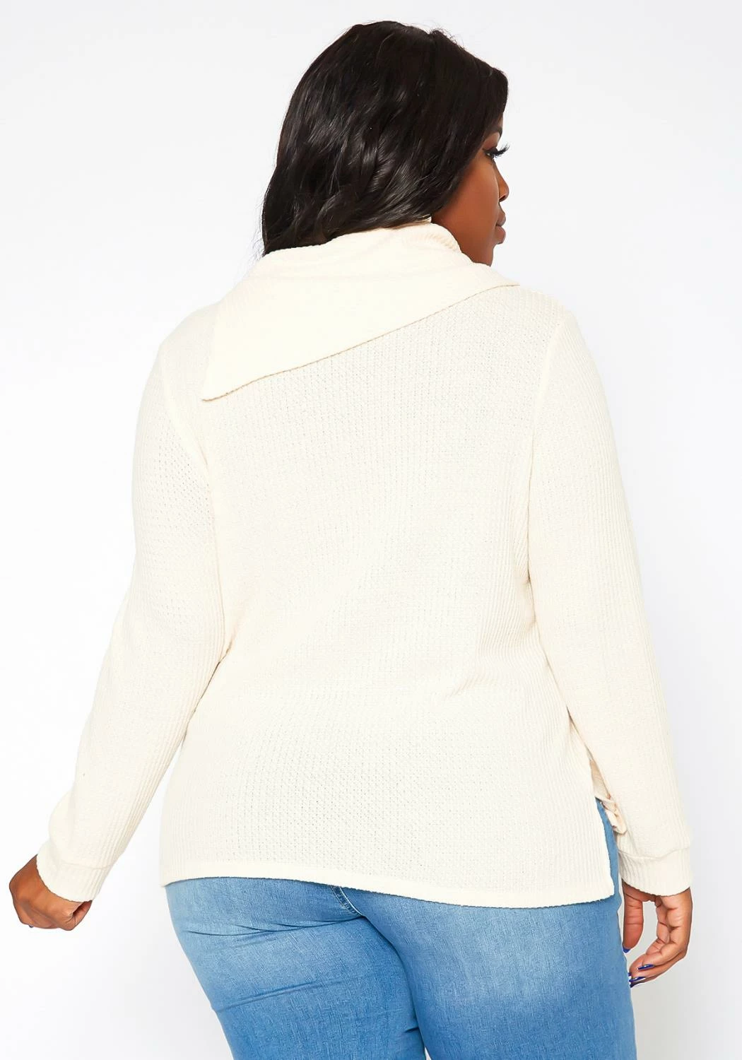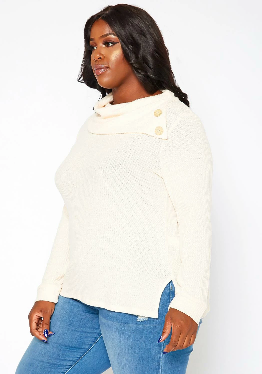 Stylish and chic plus size women’s waffle knit sweater in asymmetric cowl neck style with button hem, side slit hem and fitted long sleeves.