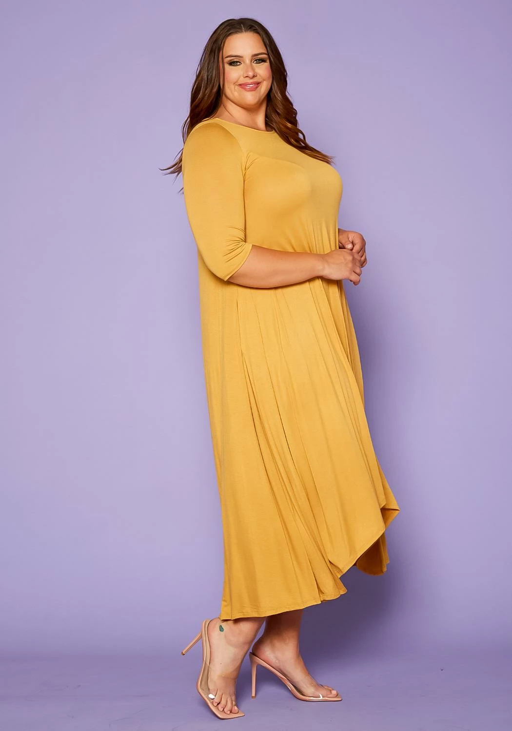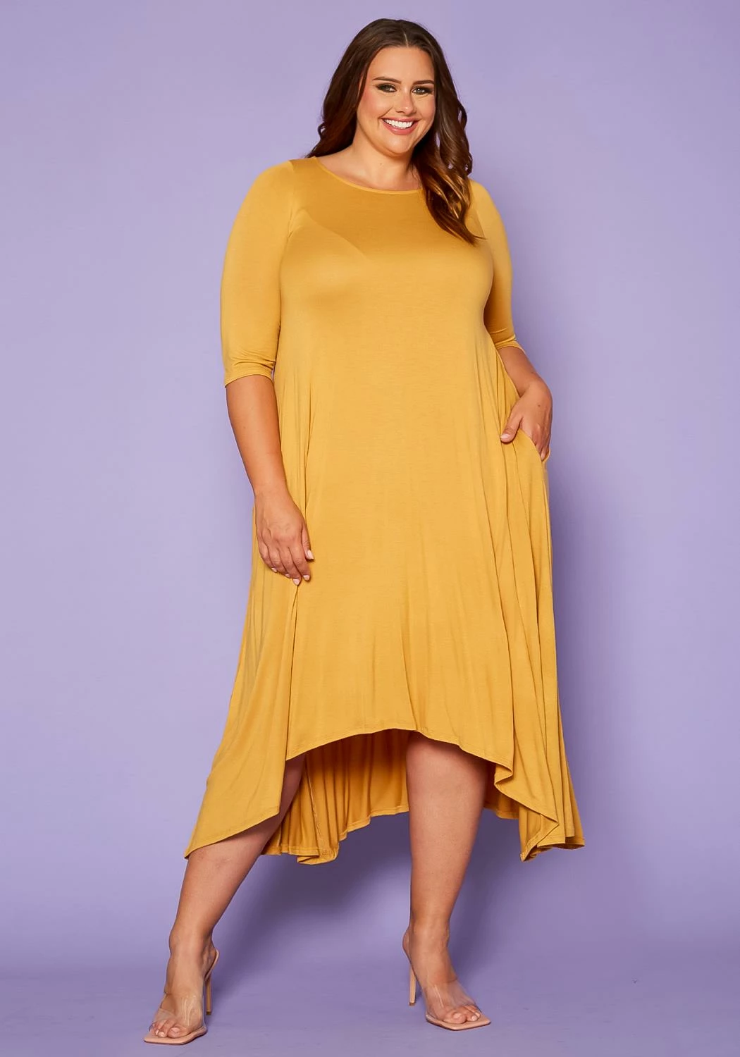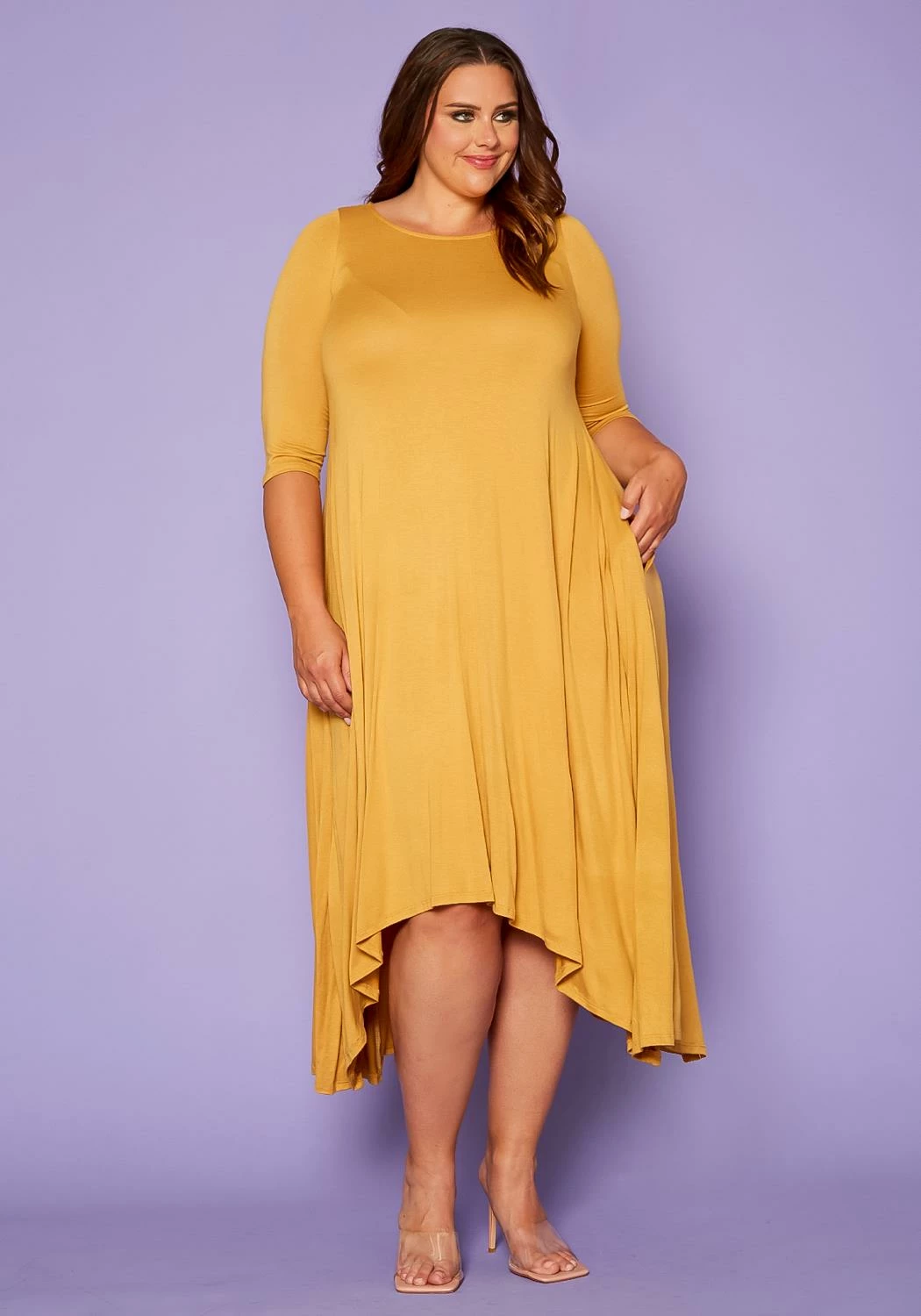 Casually gorgeous plus size women’s dress in asymmetric cut design, 3/4 fitted long sleeves, side pockets and fit & flare style.
