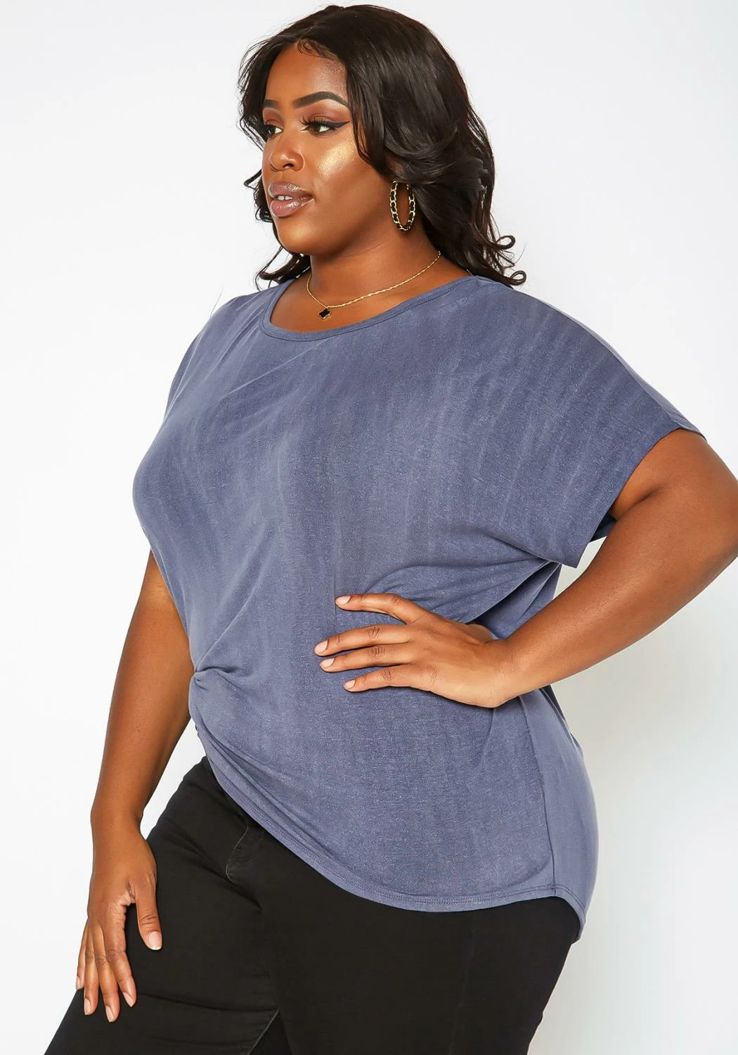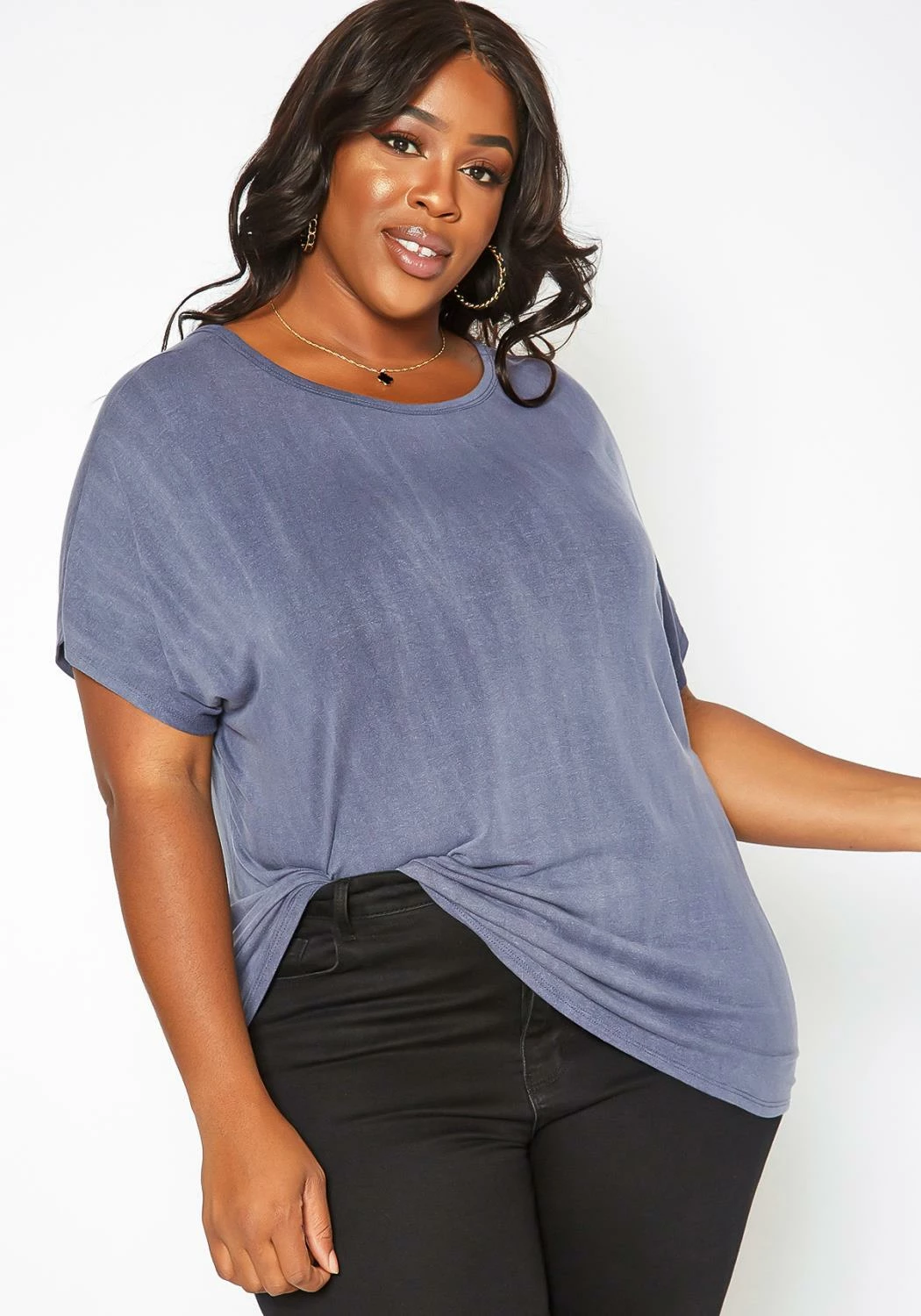 Plus size women’s casual t-shirt in round neck style, short dolman sleeves and back cross hem design.