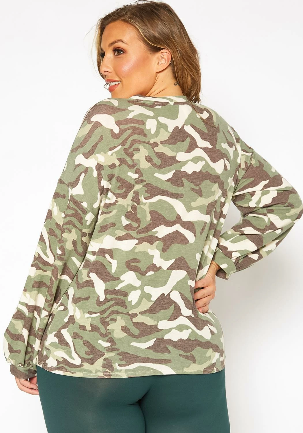 Plus size women’s casual camo print statement sweater in crew neck style, loose long sleeves, fitted wrist cuffs and triangle stitch hem.