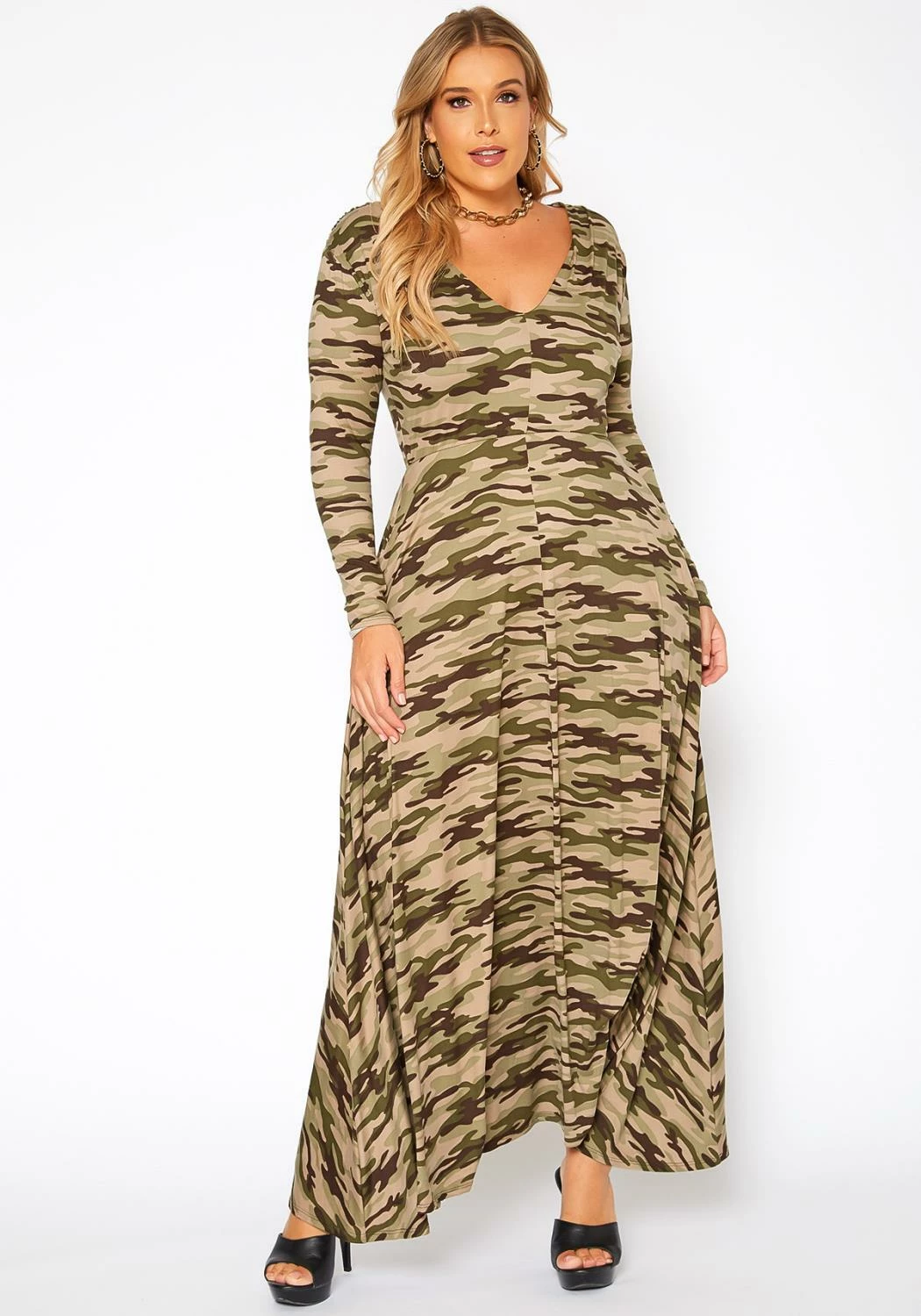 Outstanding plus size women’s camo print maxi dress in fit & flare style, fitted long sleeves, v-neck front and pocket ascent.