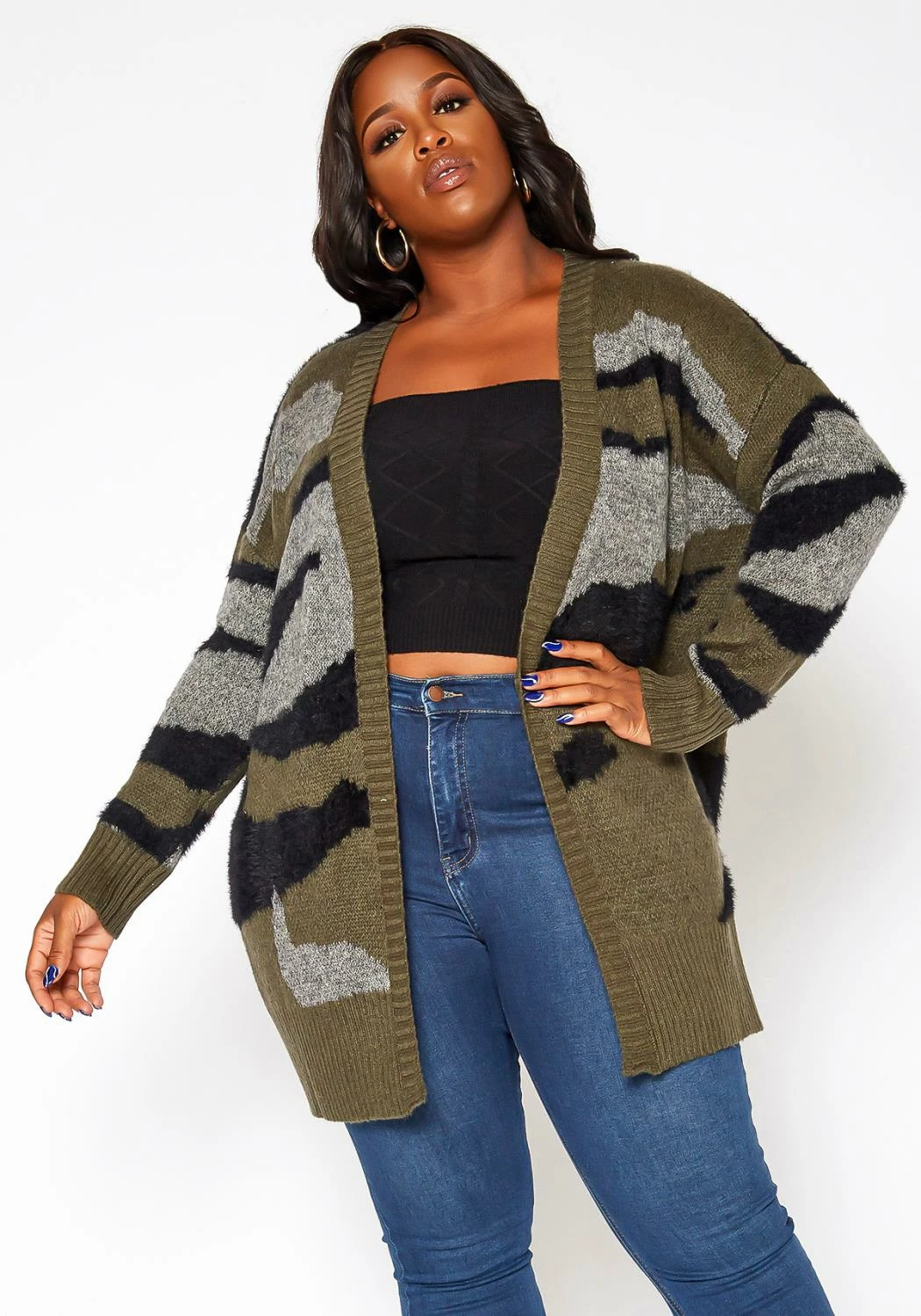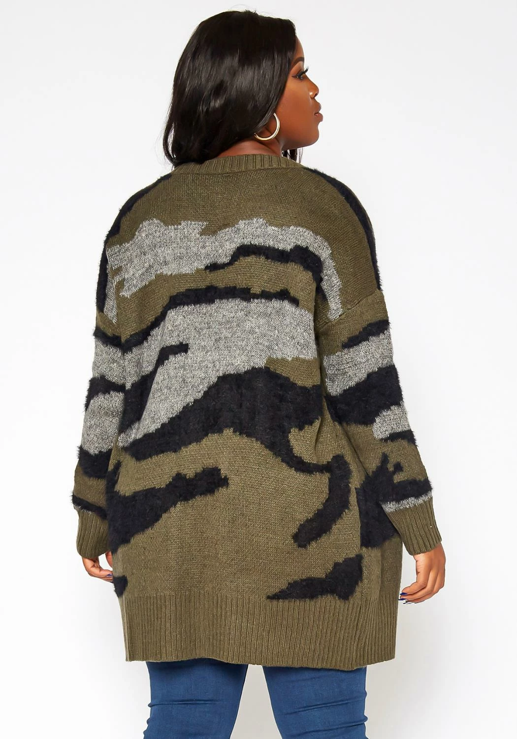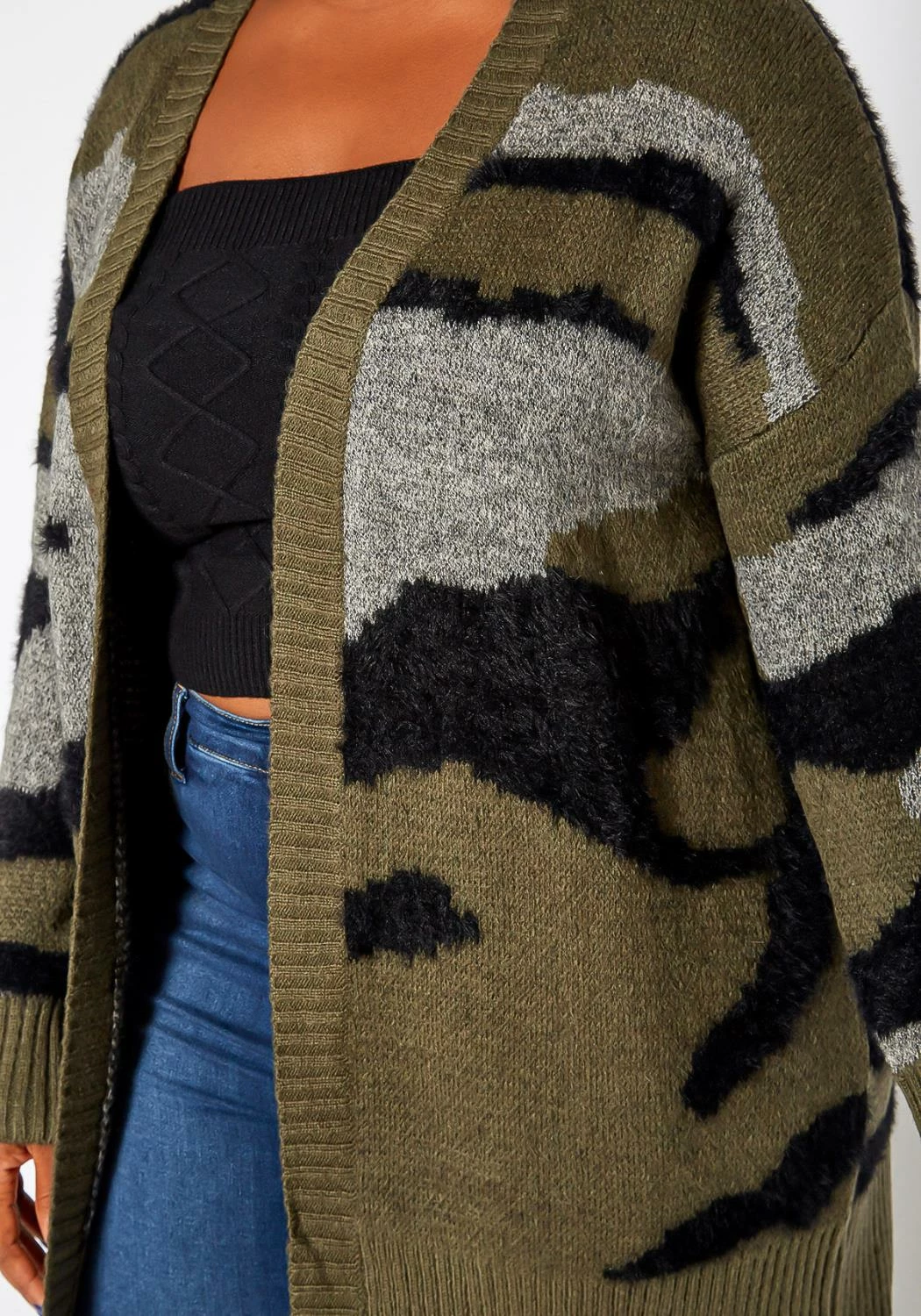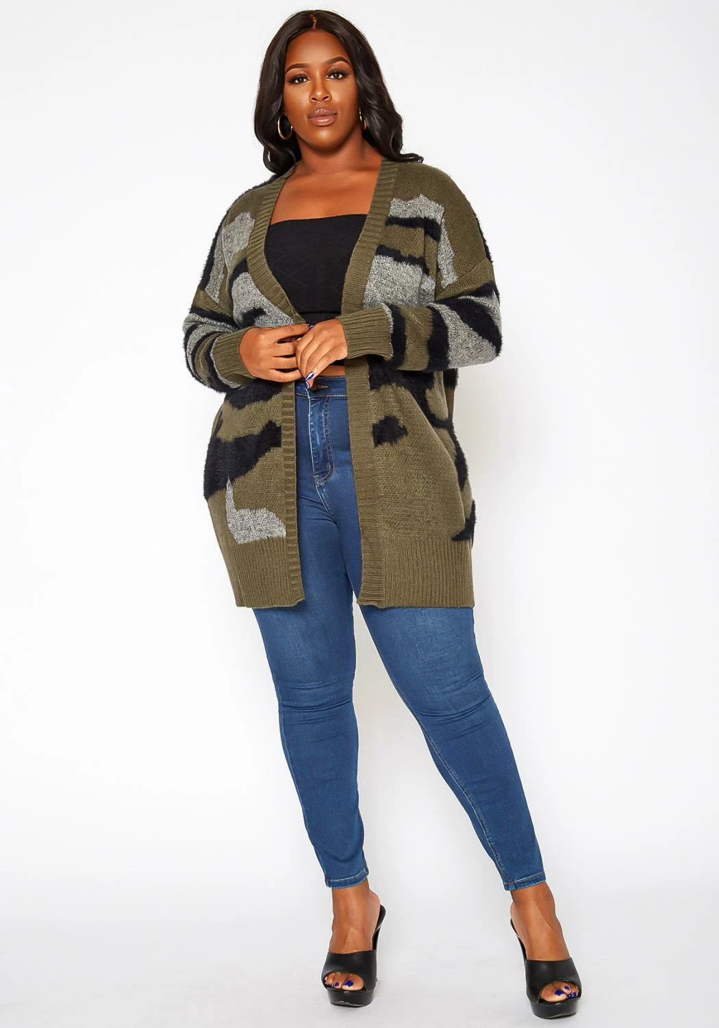 Essential cozy cardigan for plus size women which features a camo print, open front style, drop shoulder long sleeves and longline length.