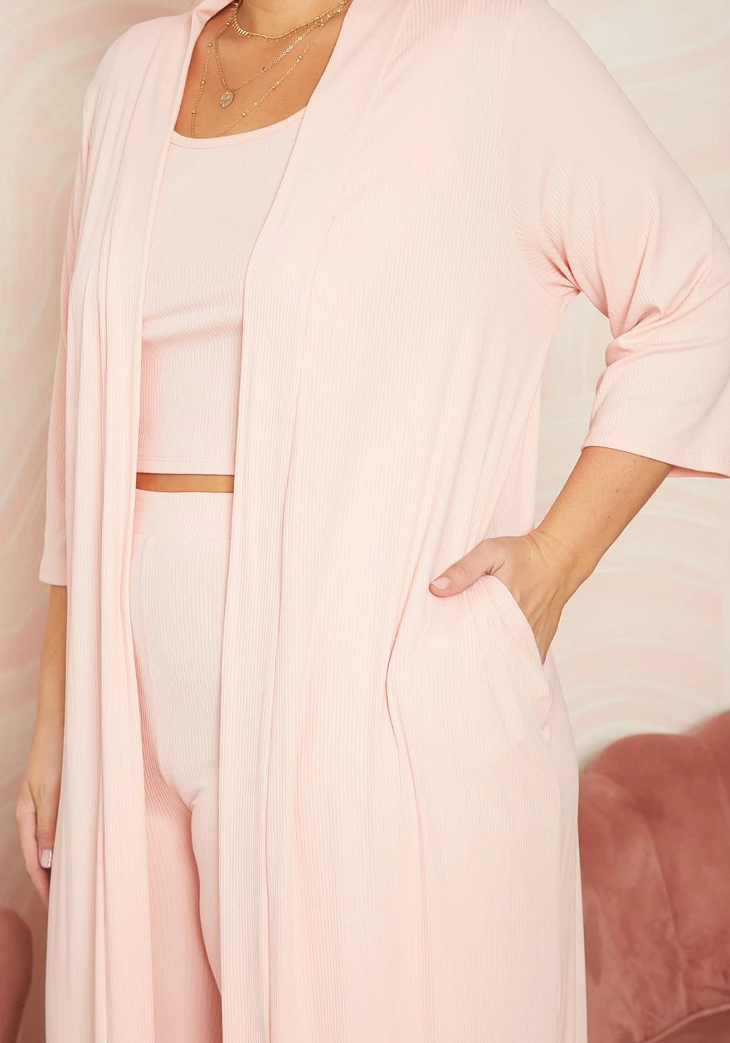 Plus size women’s comfy three piece ribbed knit set, featuring sleeveless cropped tank top with high rise biker short leggings and throw on longline open-front cardigan in half sleeve design.