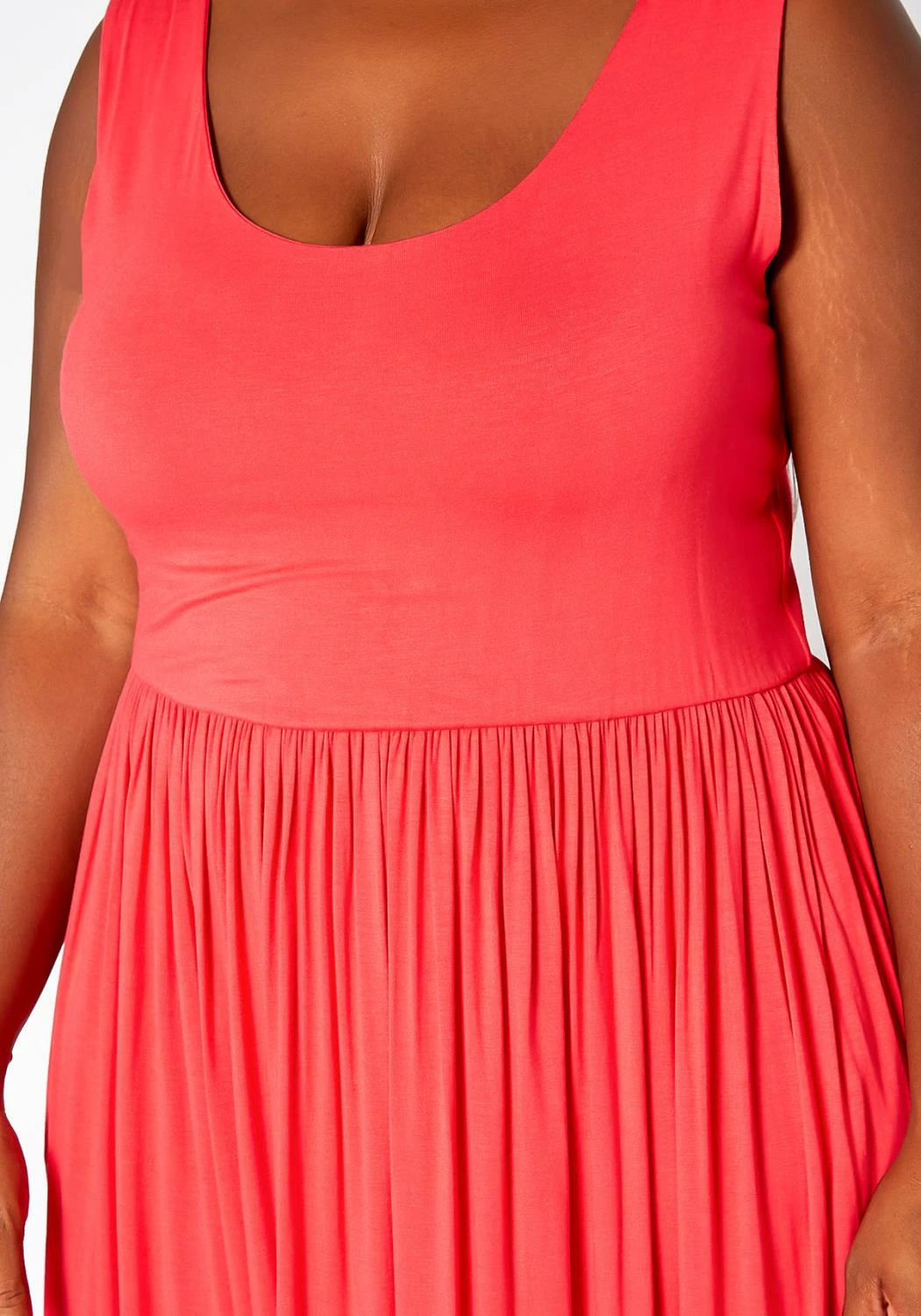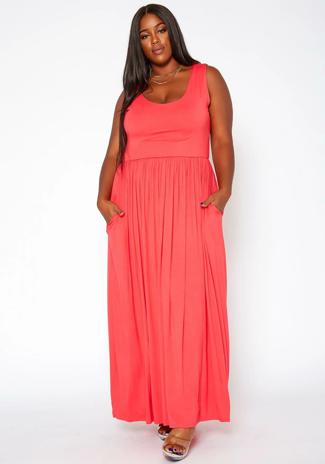 Simple yet lovely plus size women’s maxi dress in fit to flare design, v-neck style, sleeveless and with pocket ascent.