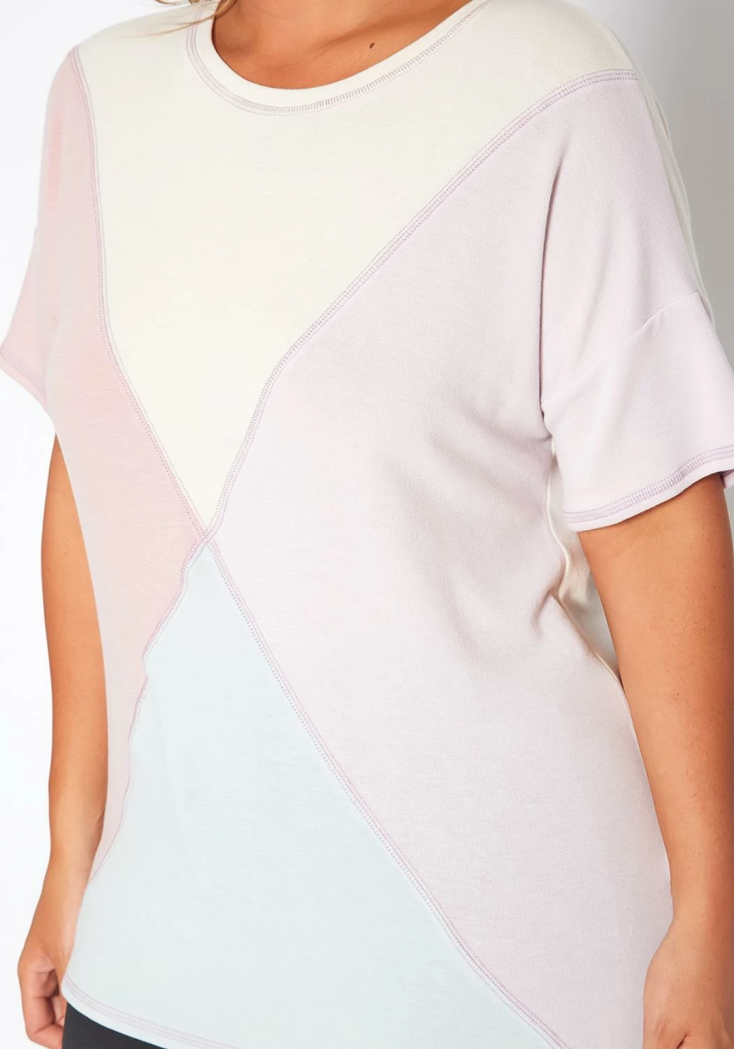 Must have basic t-shirt for plus size women which features a color block design, stitch trim, crew neck style, short sleeves and relaxed fit.