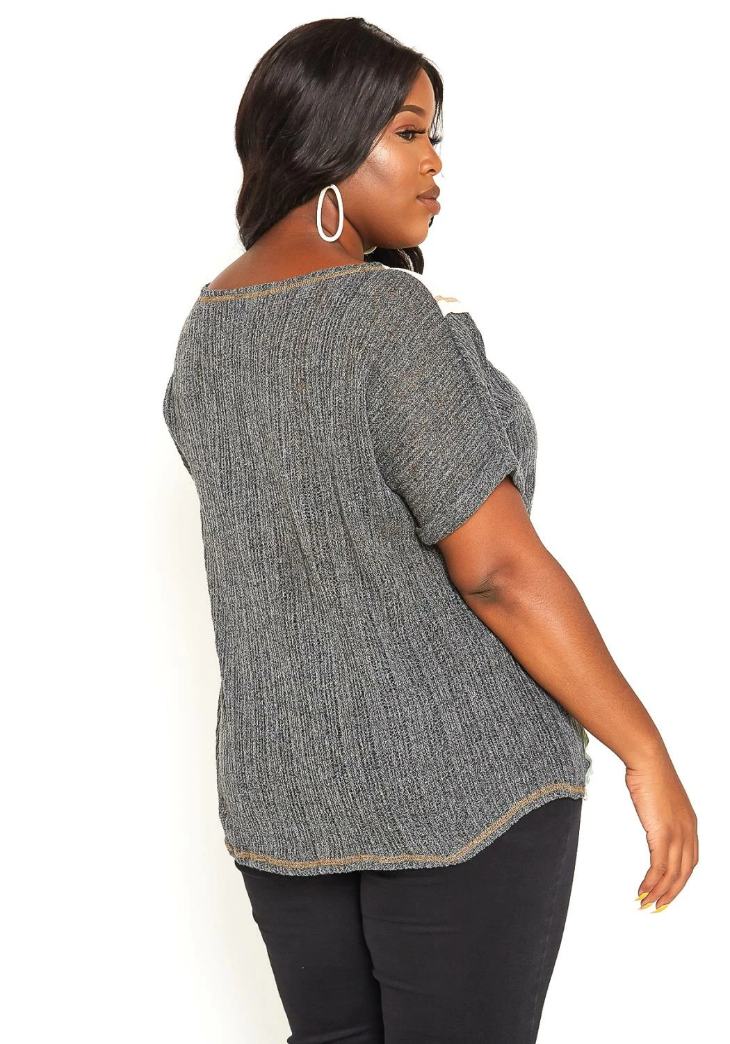 Plus size women’s lightweight thin knitted top with pastel color blocking.