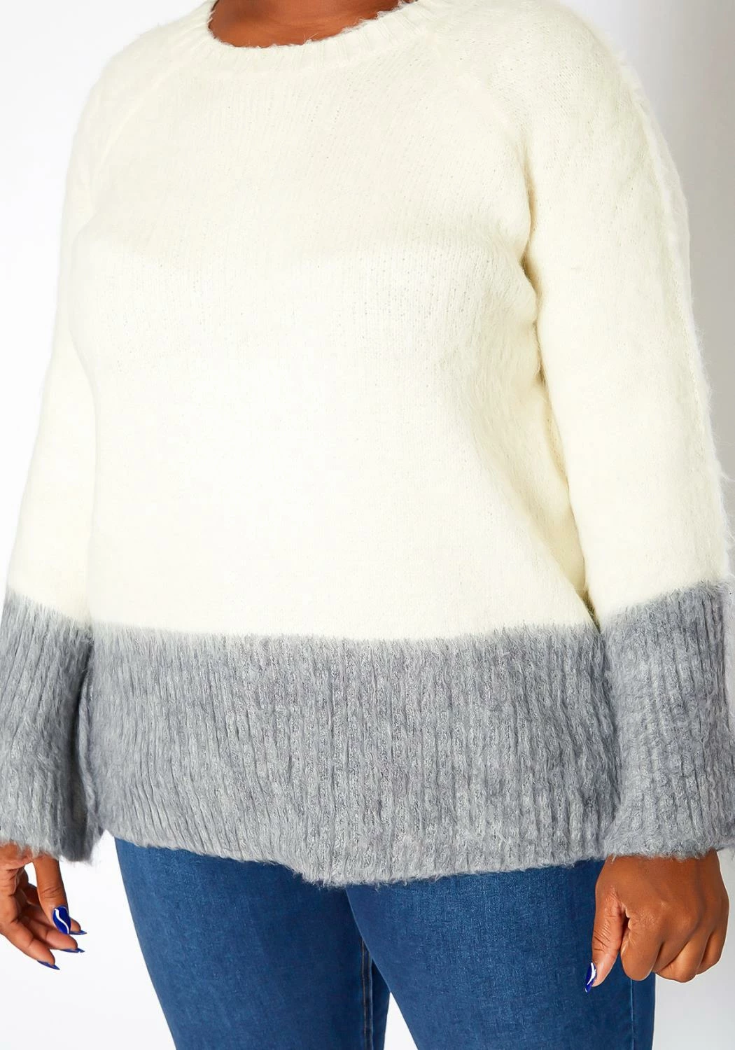 Cozy plus size women’s knit sweater in color splice design, crew neck style and angel flare long sleeves.