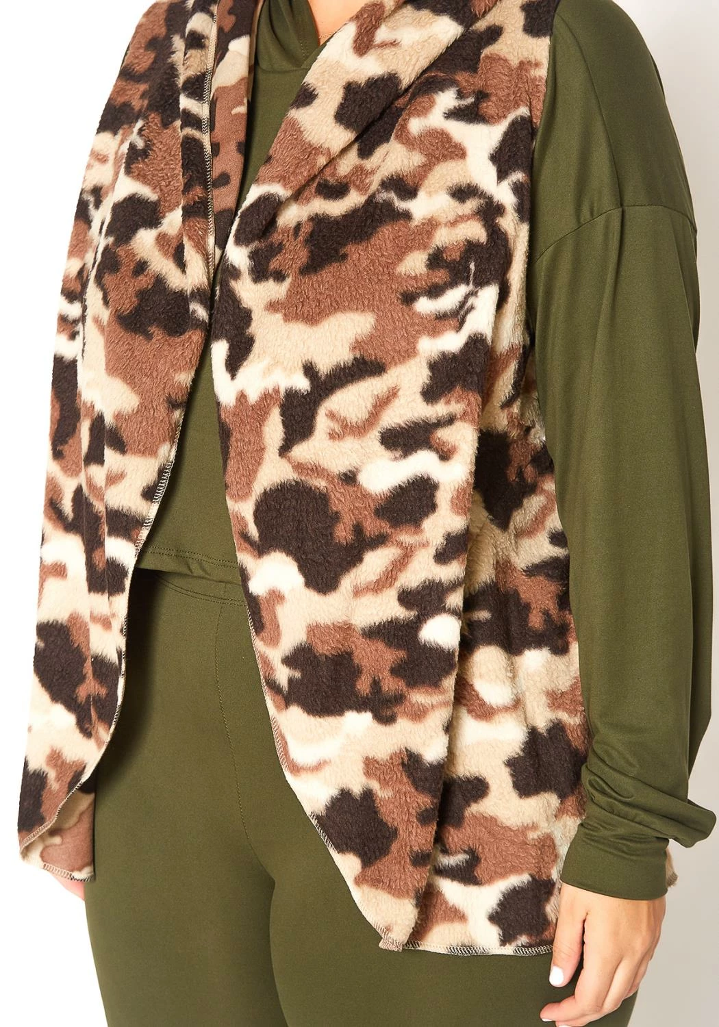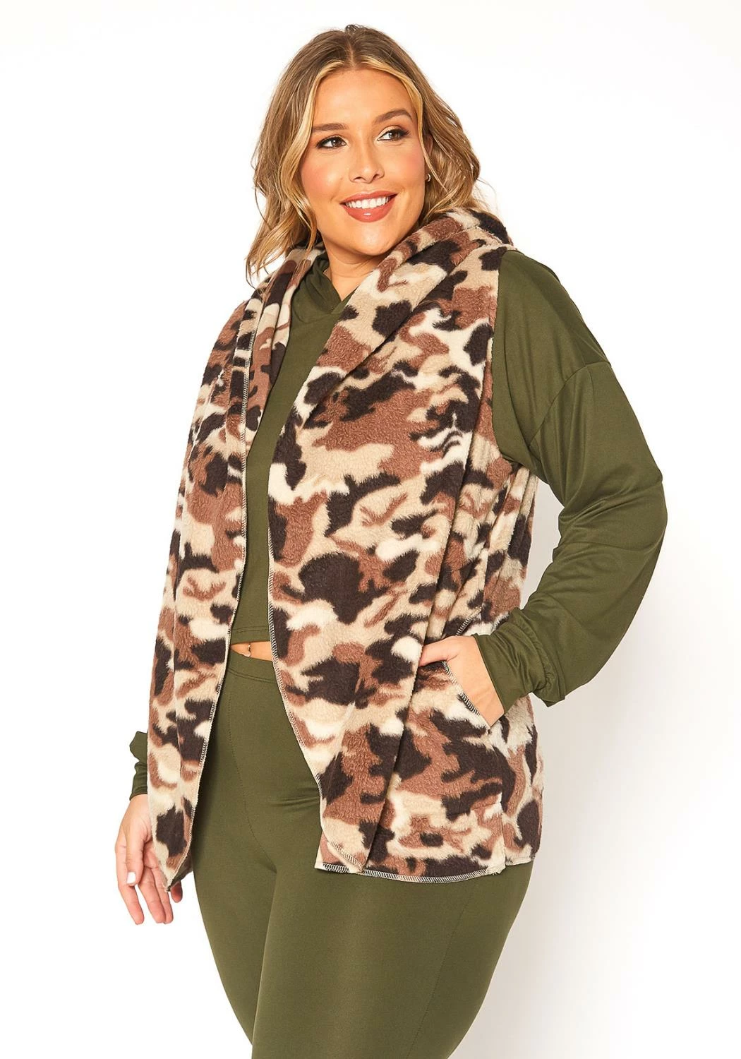 Keep warm and toasty in this plus size women’s cozy camo print hooded vest which features side pockets and open front style.