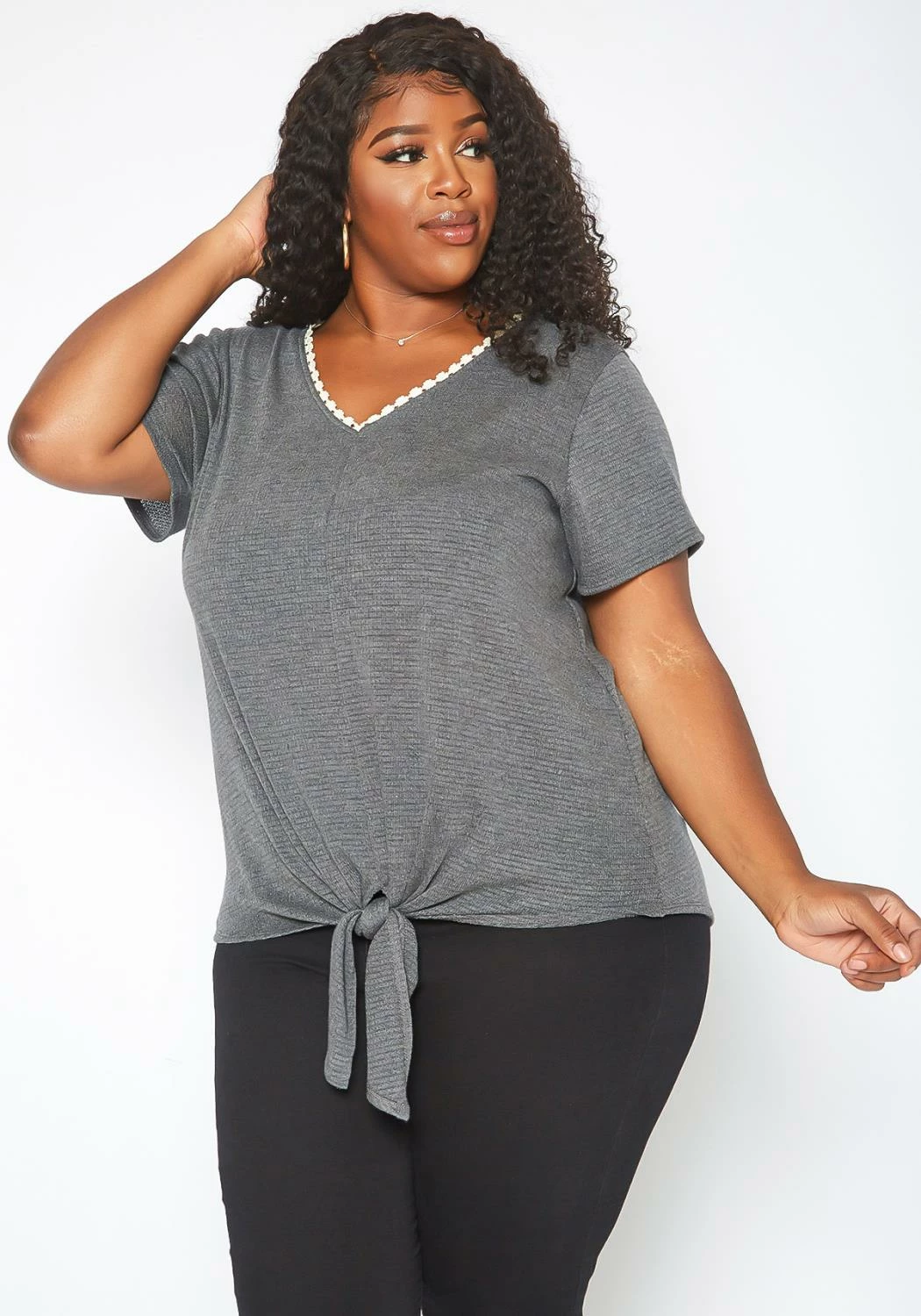 Casual yet stylish plus size women’s basic t-shirt in ribbed material, v-neck style, crochet trim, short sleeves and front tassel tie ascent.