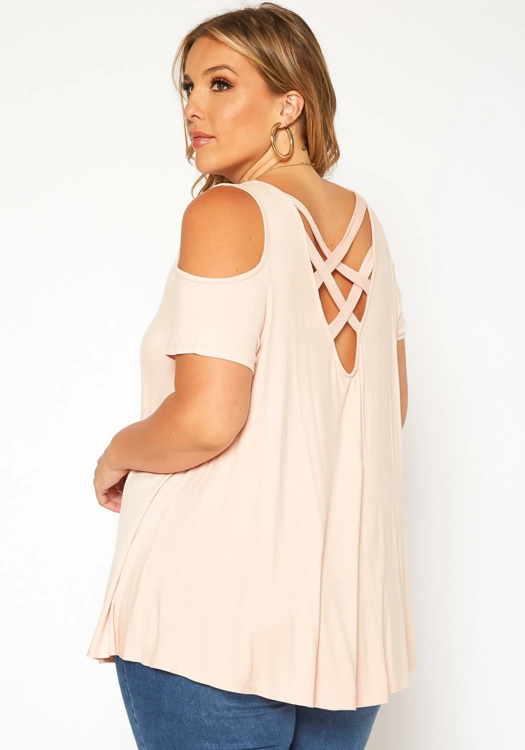 Plus size women’s basic top in cold shoulder style, short sleeves, round neck style and cross lace back design.