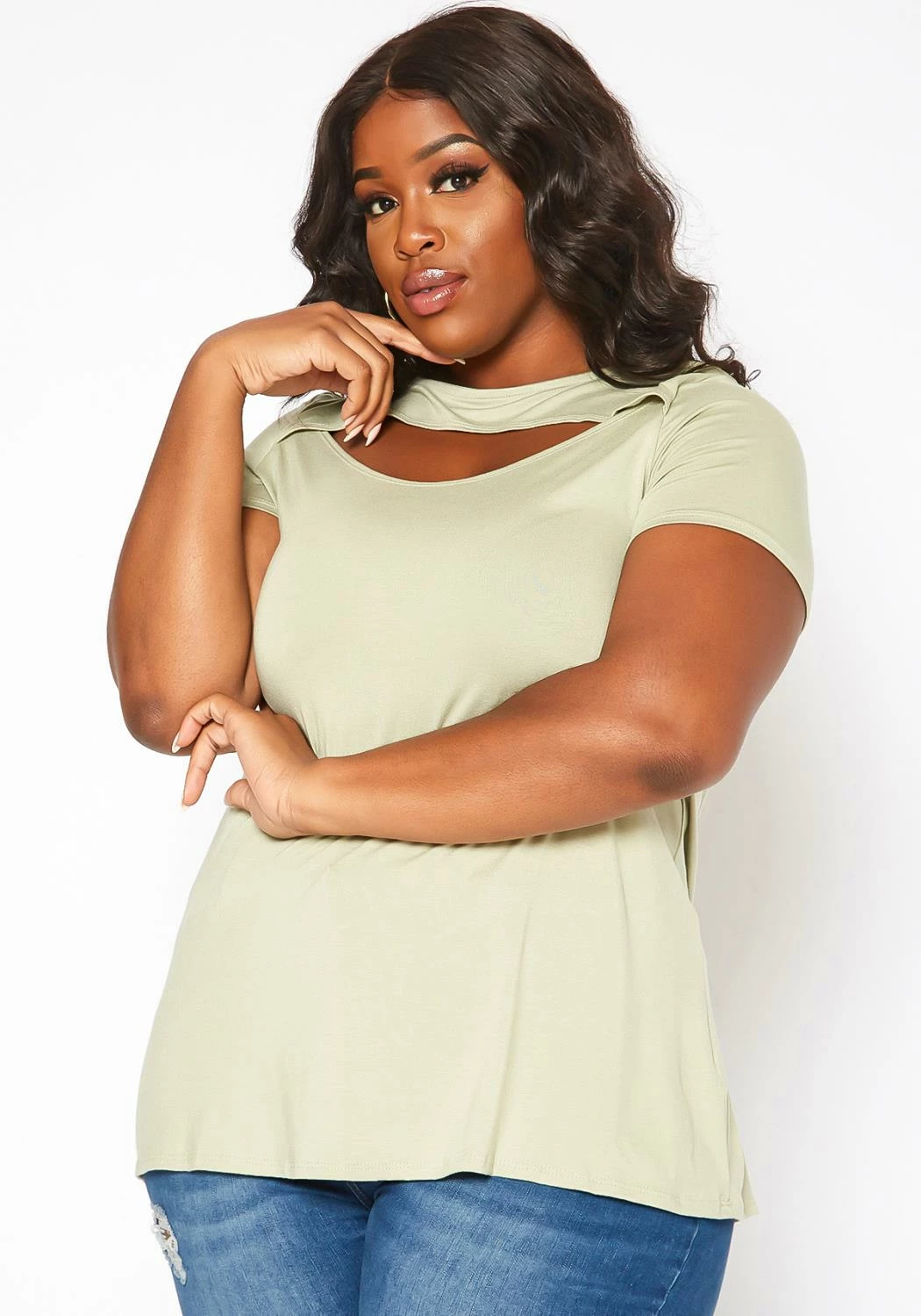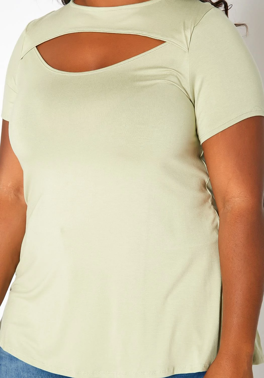 Trendy plus size women’s basic t-shirt with cut-out front design and short sleeves.