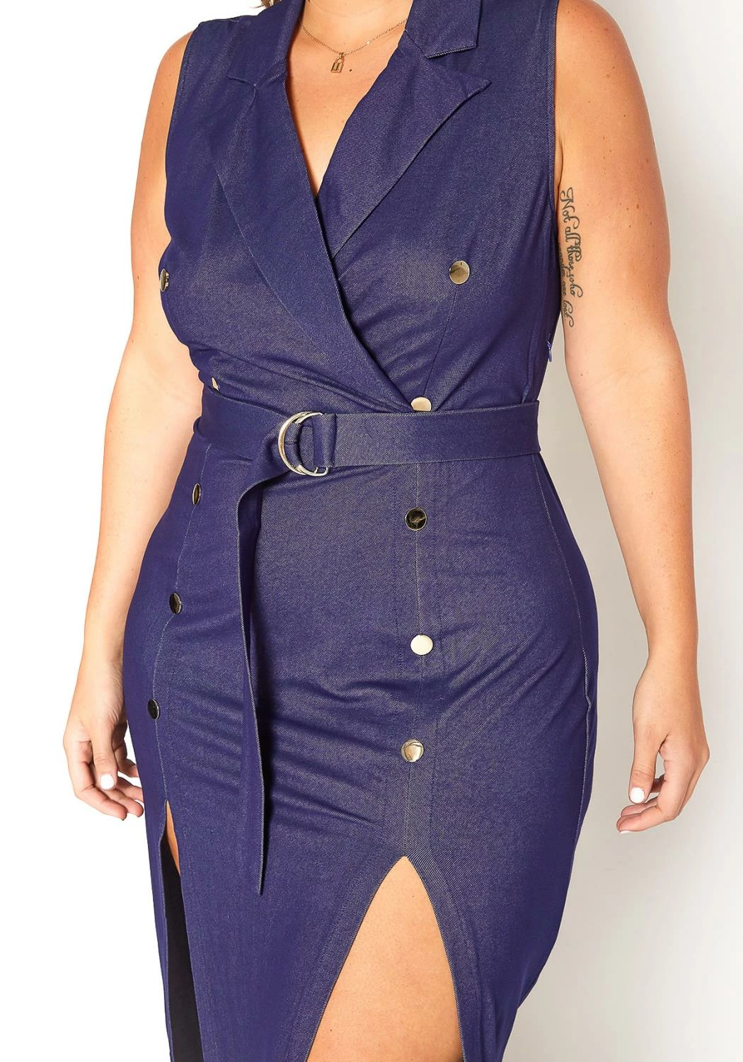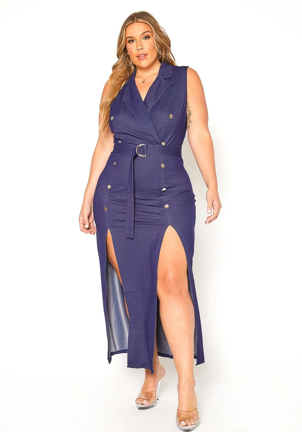 Plus size women’s sleeveless denim maxi dress featuring a collar style, double sided slits and detail faux buttons. Includes waist denim D-ring belt.