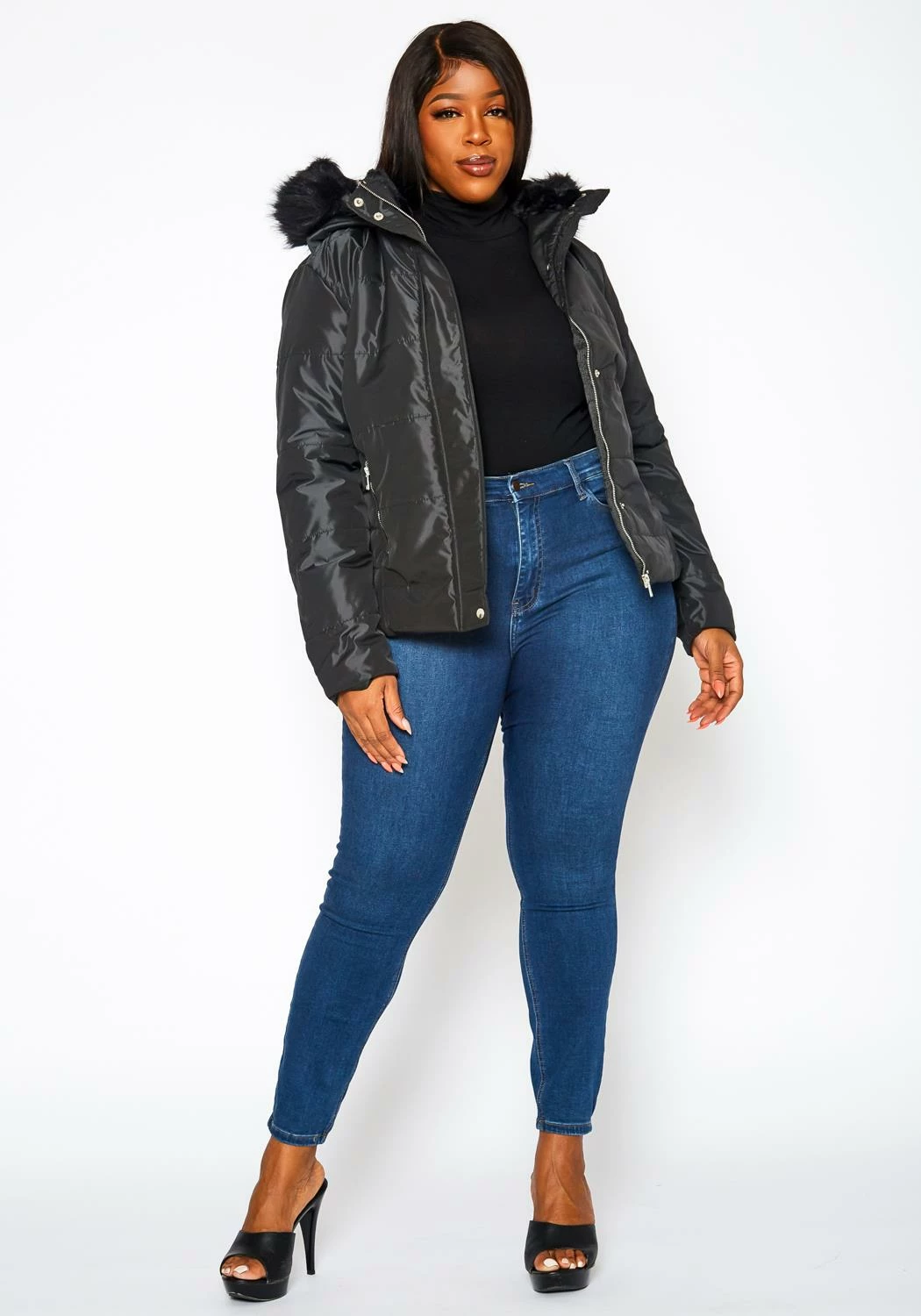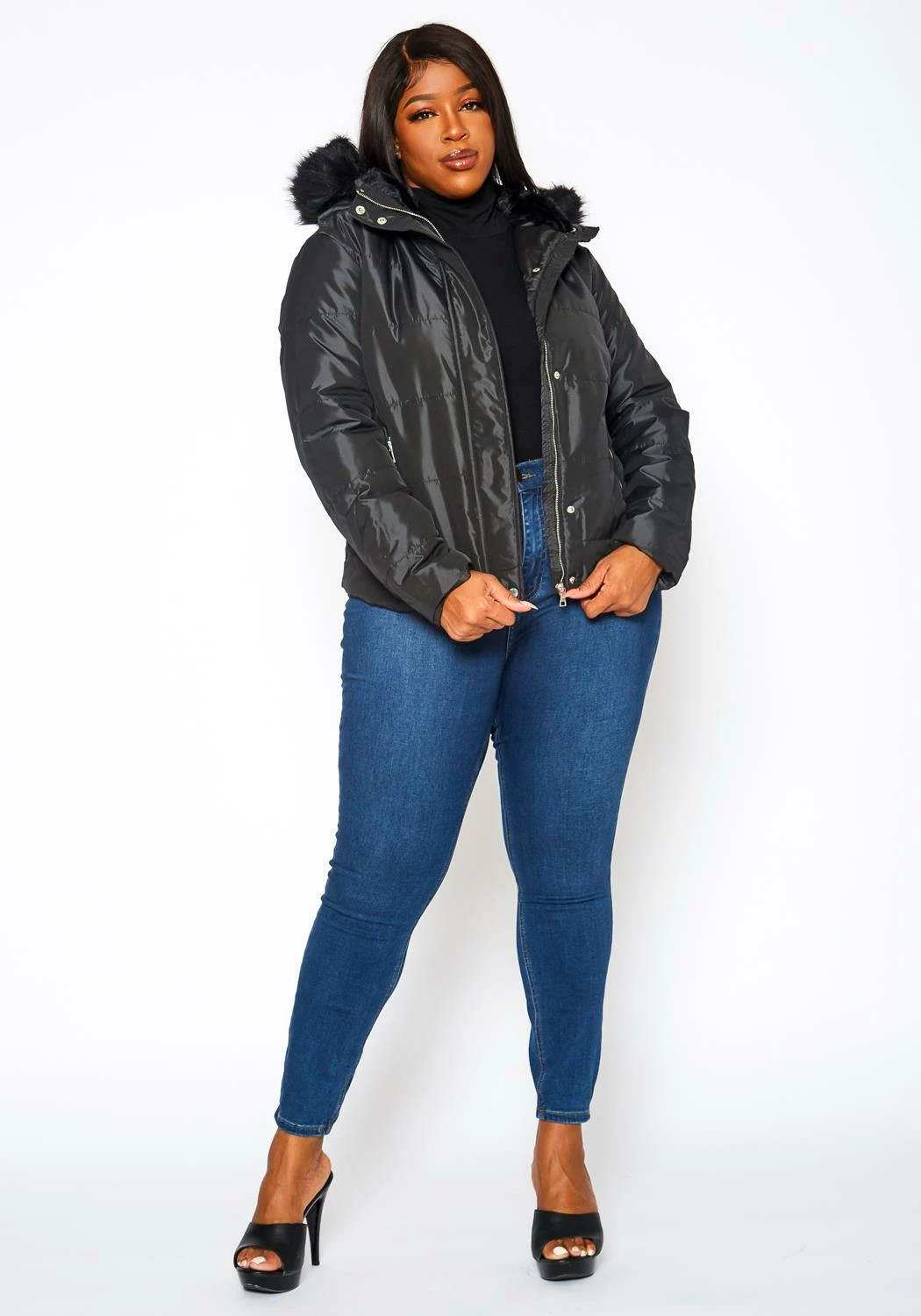 Plus size women’s ultra warm faux fur winter jacket with zipper pockets.