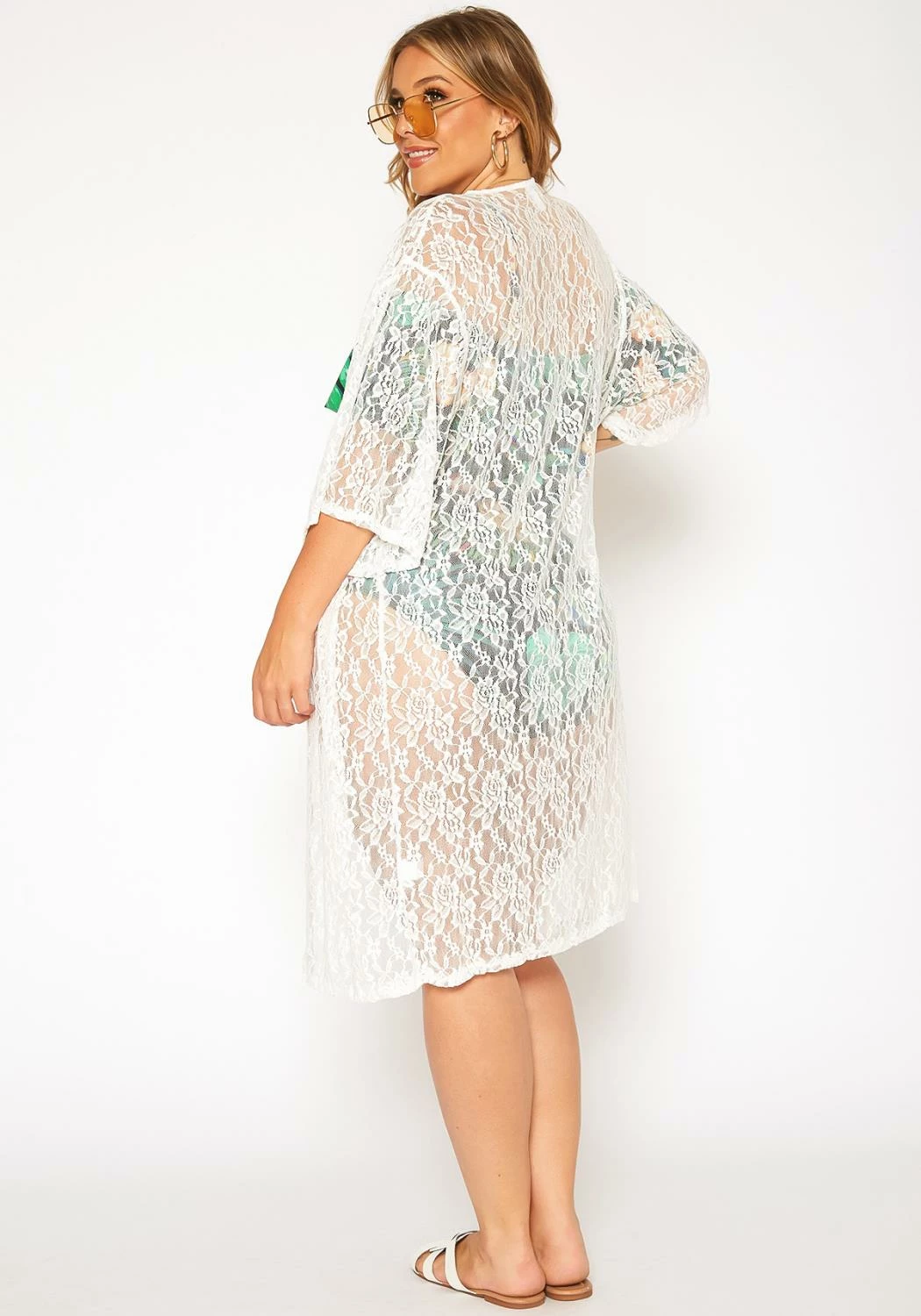 Effortless plus size women’s cover up kimono cardigan in floral lace mesh material, open front style and loose half sleeves.
