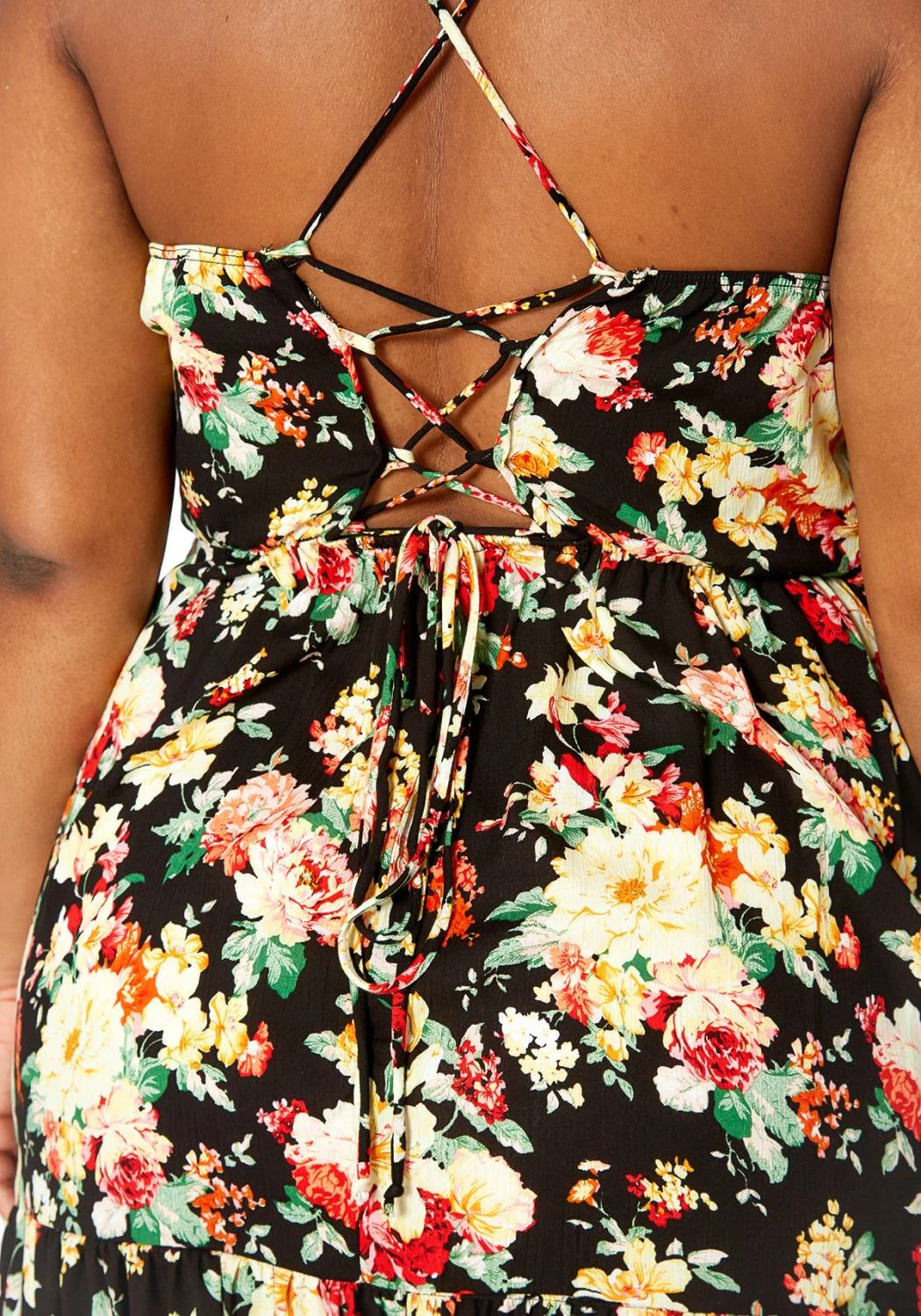 Gorgeous summer essential dress for plus size women that features a floral print design, mini ruffle flare end and crosslace back tie.