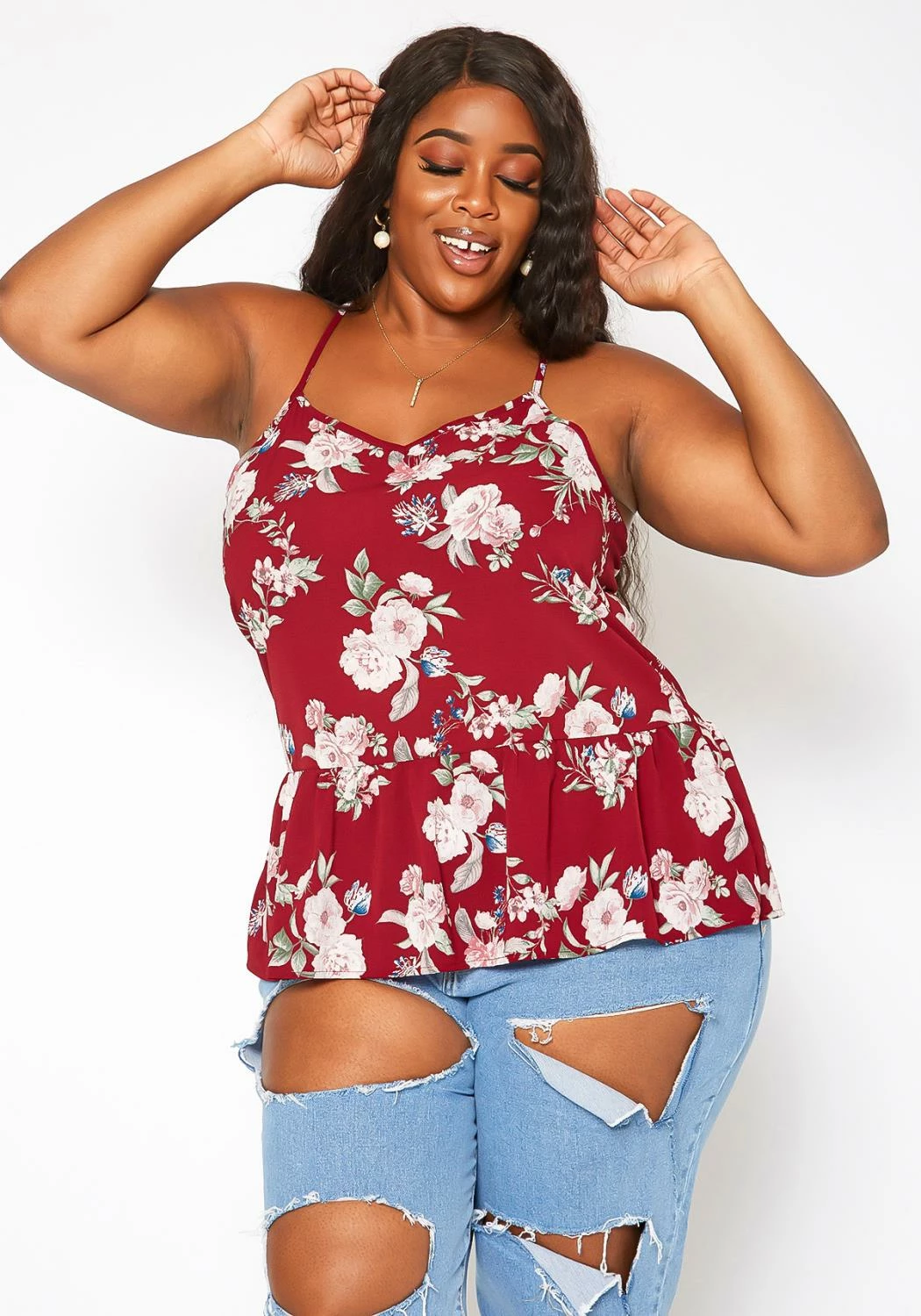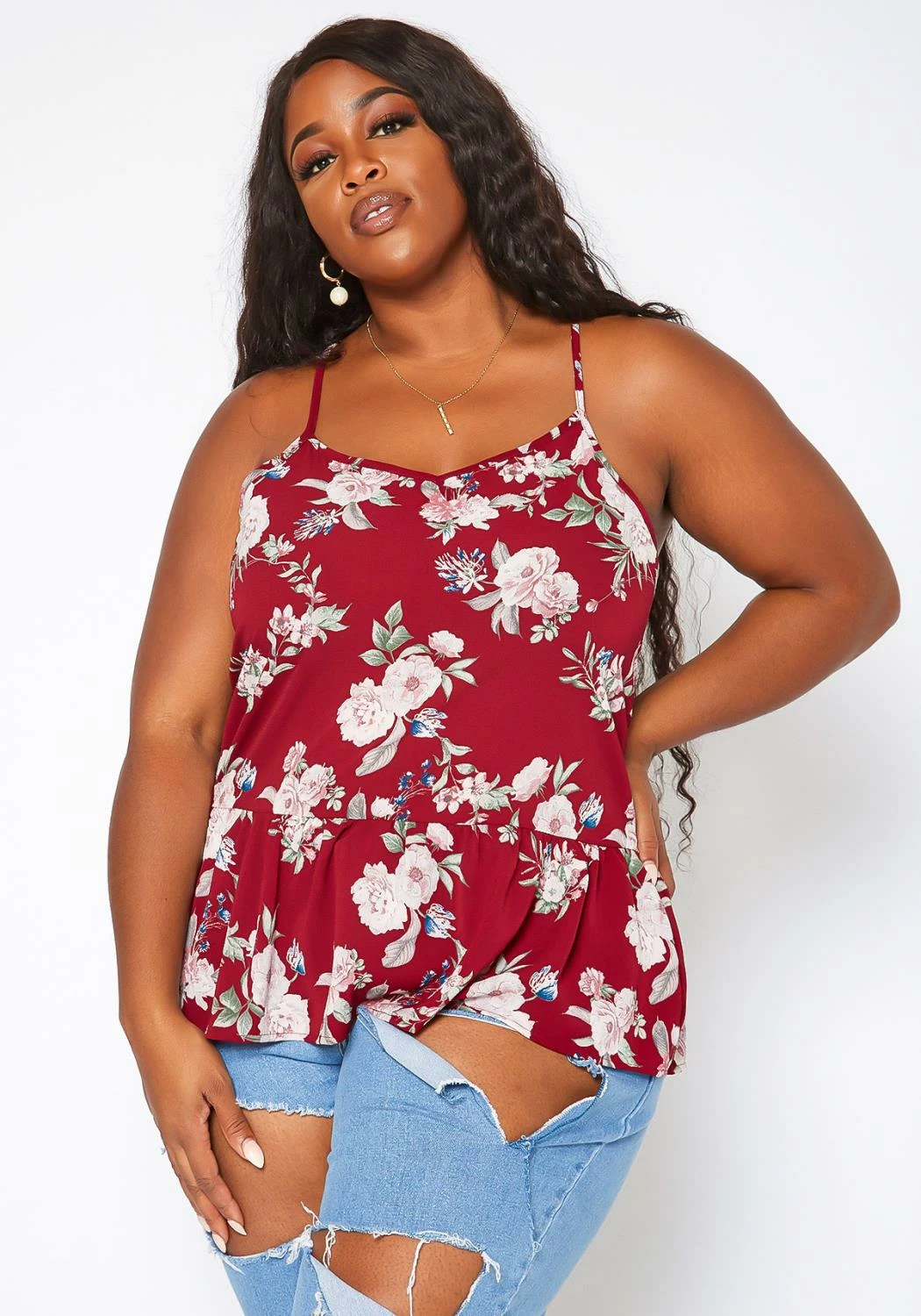 Lovely plus size women’s cami top in floral print, v-neck front, adjustable cami shoulder straps, peplum flare and racerback design.