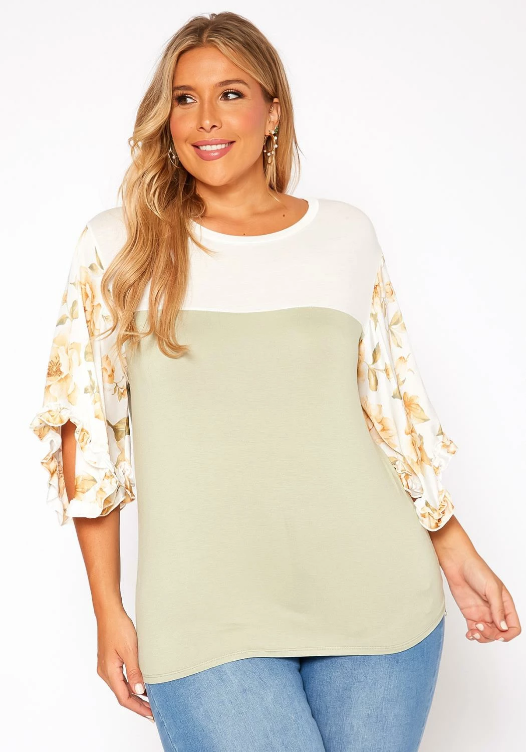 Lovely plus size women’s top in crew neck style, color block design and floral print contrast half sleeves with ruffle trim hem.
