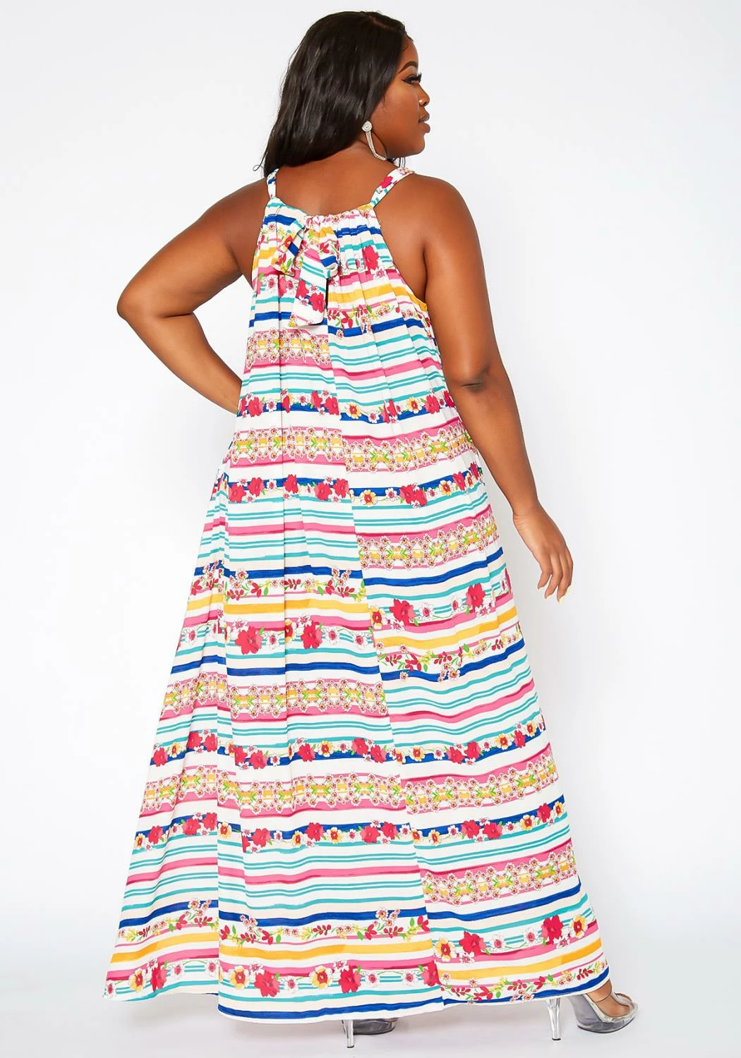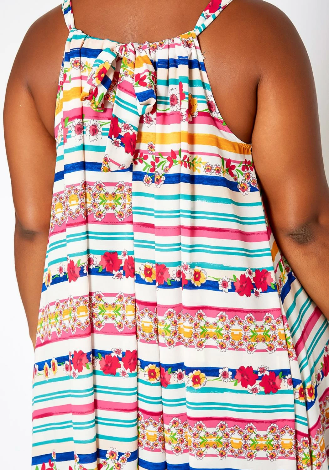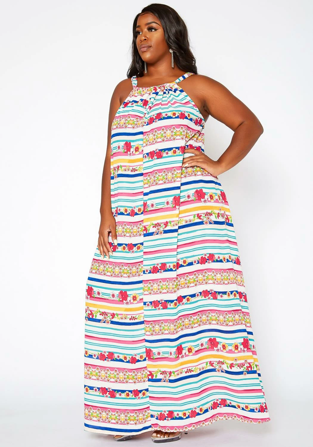 Delightful plus size women’s maxi dress in floral stripe pattern, sleeveless design, fit to flare end, pocket ascent and self tie closure.