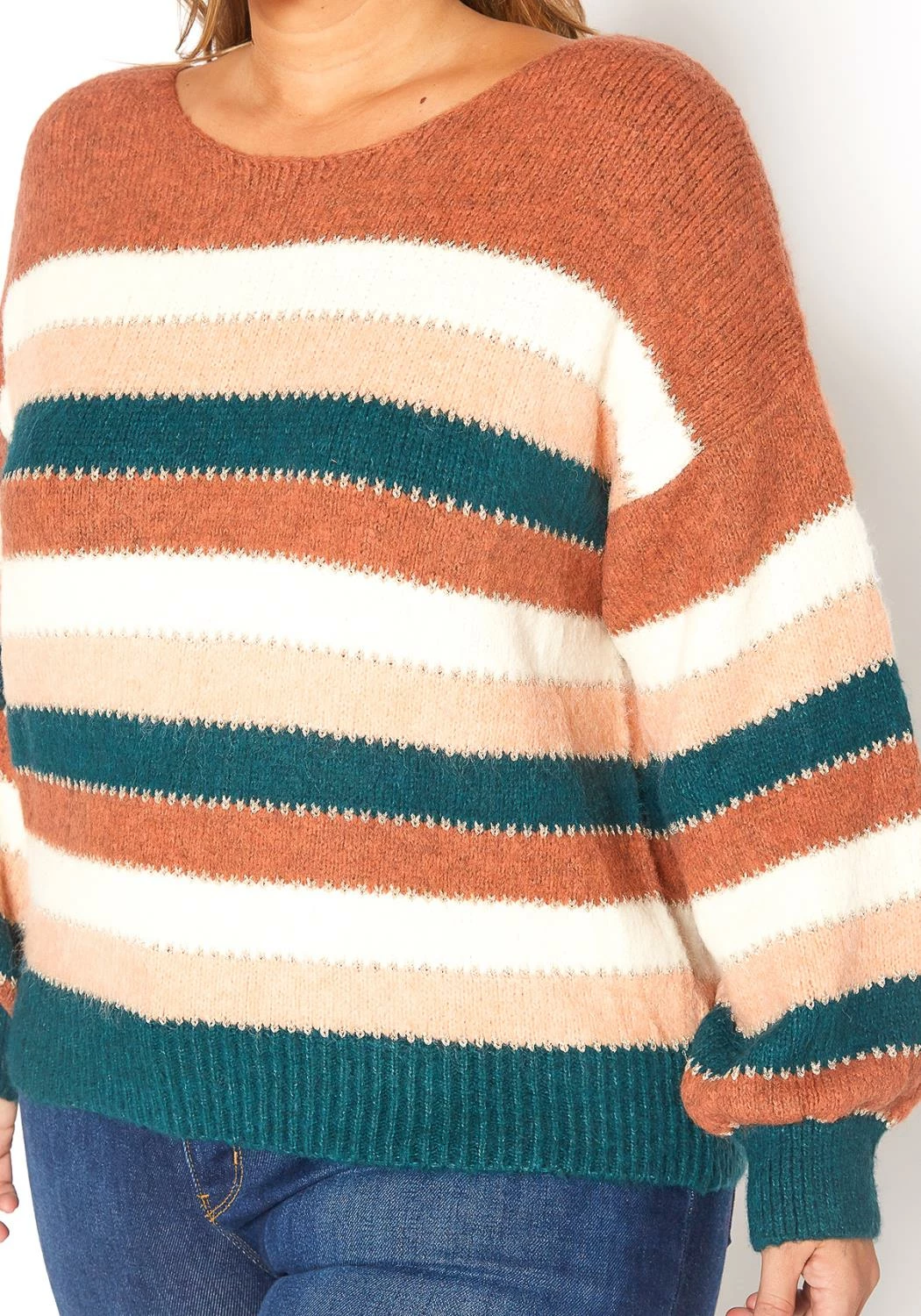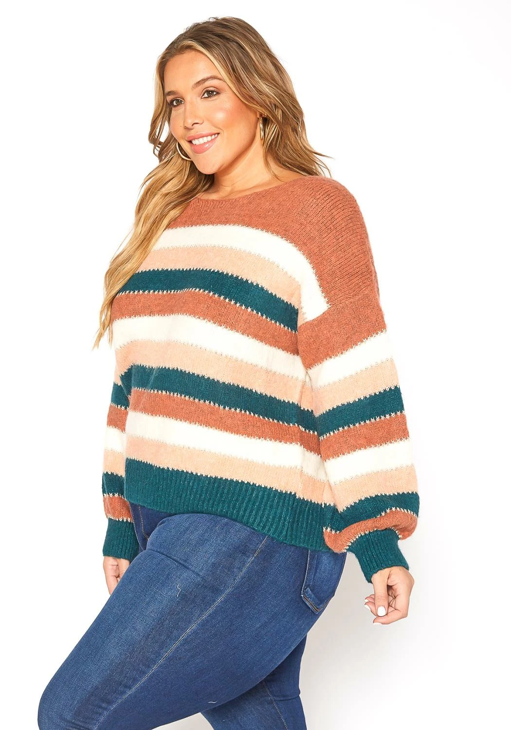Plus size women’s ultra soft fuzzy crewneck sweater top with multi color stripes.