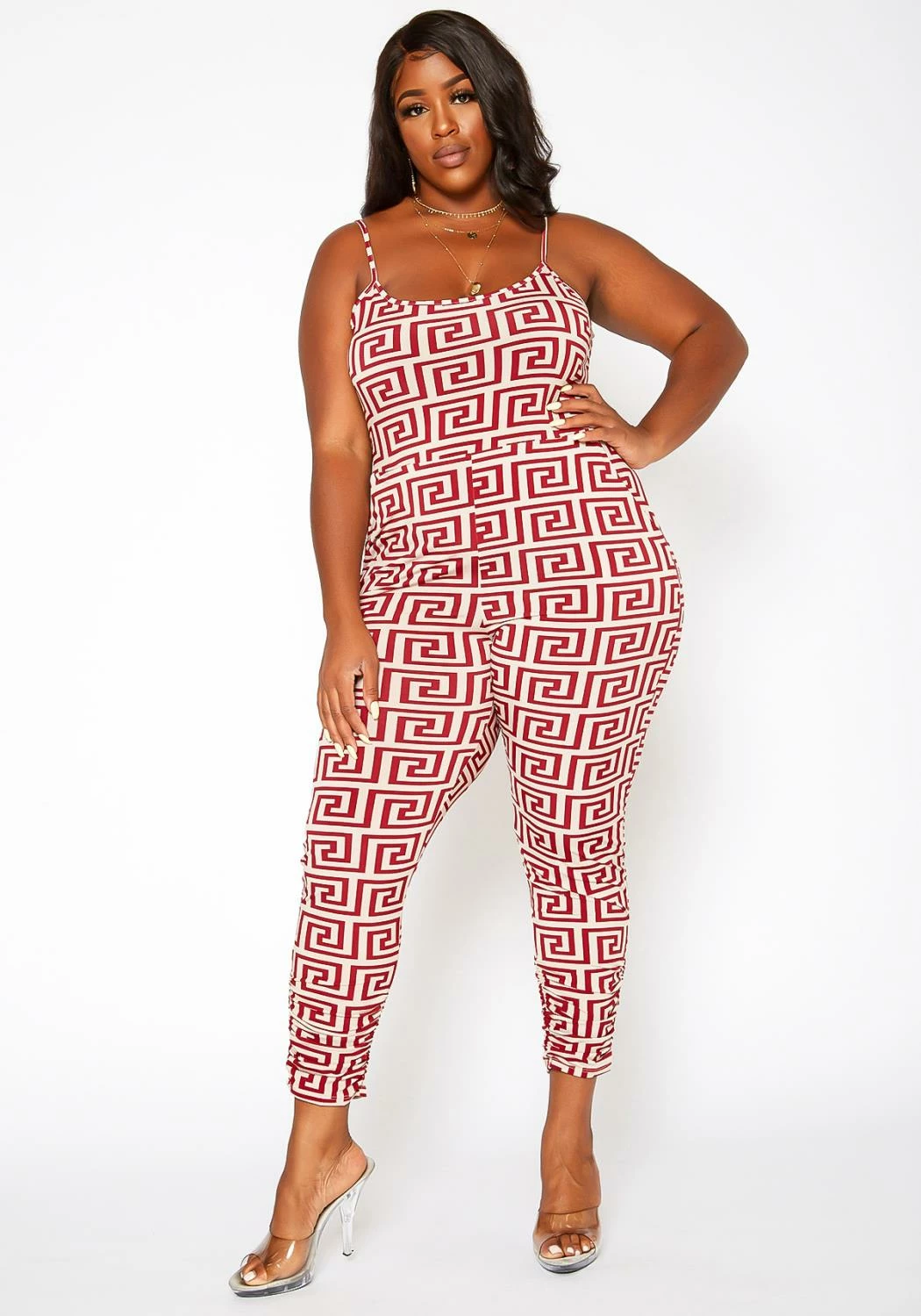 Attention grabbing plus size women’s jumpsuit in greek key print, scoop neck front, ruched ankle hem and bodycon fit.