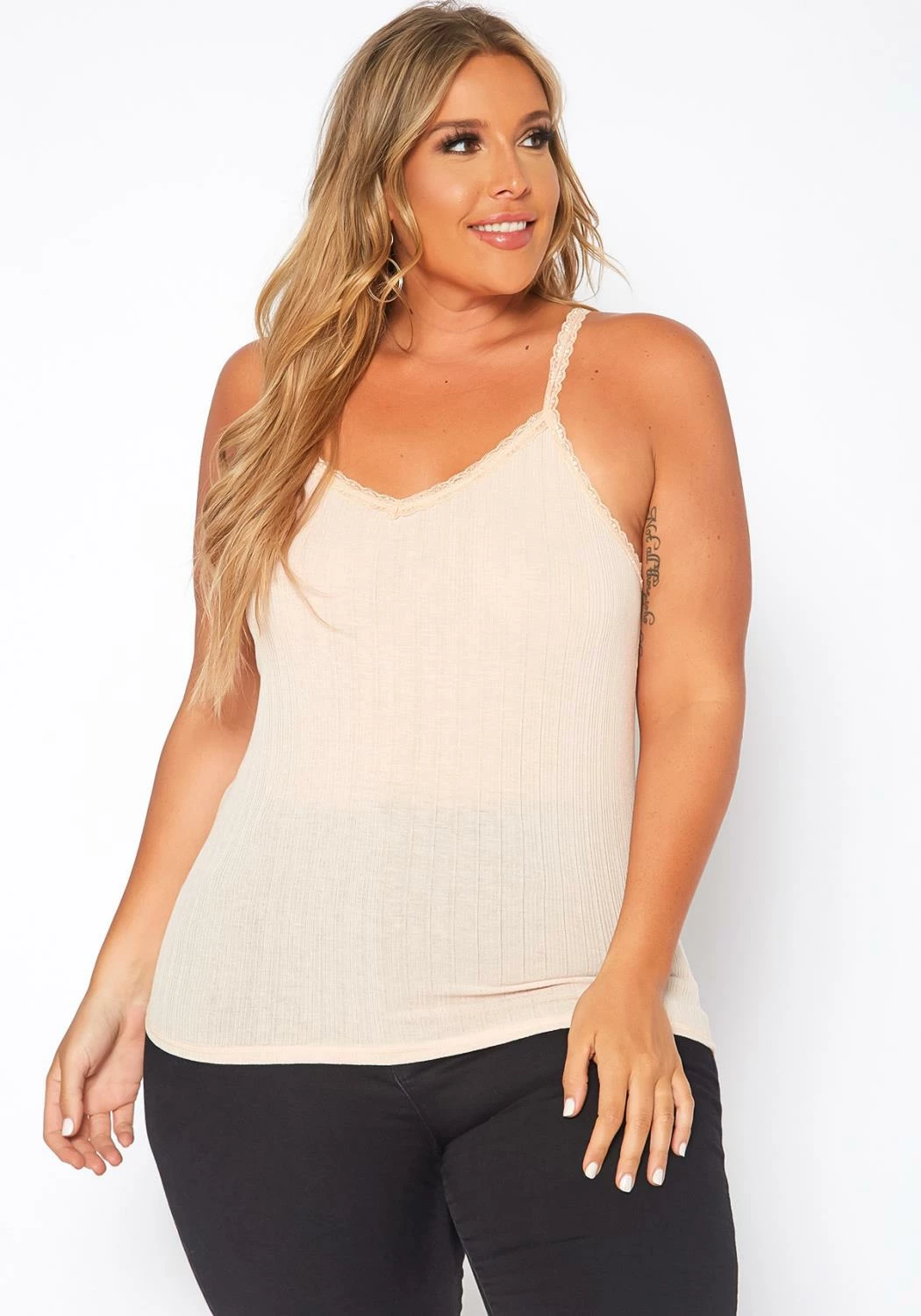 Must have basic top for plus size women which features lace trim details, v-neck style and comfy ribbed knit material.