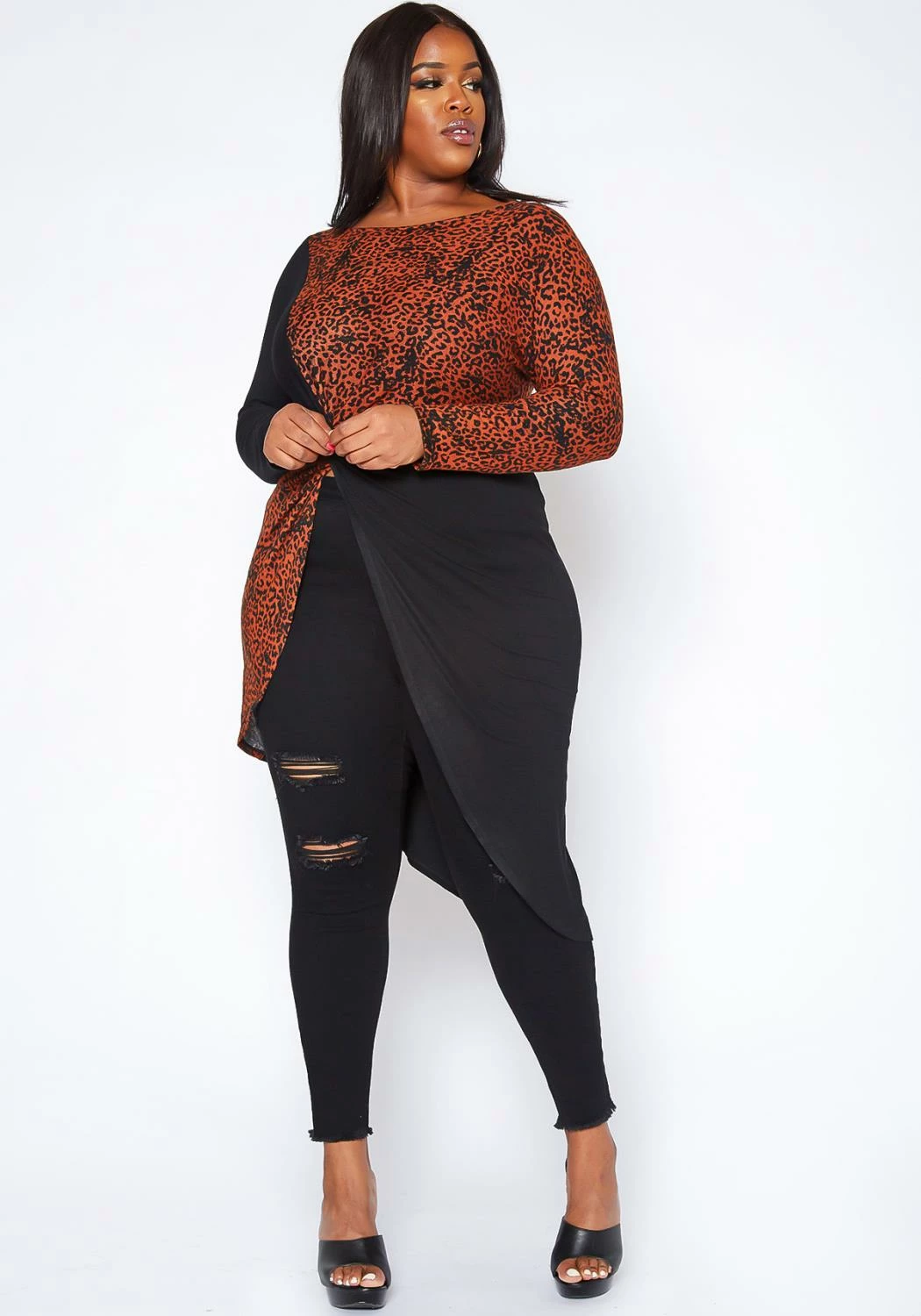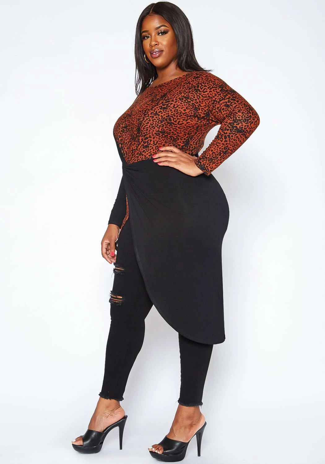 Trendy plus size women’s high to low top in leopard print contrast design, side knot detail, fitted long sleeves and asymmetric end.