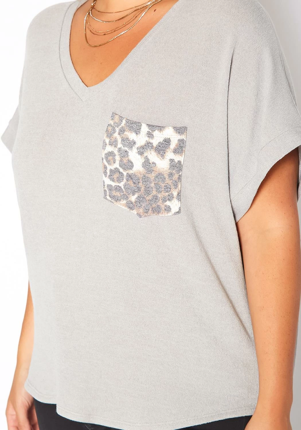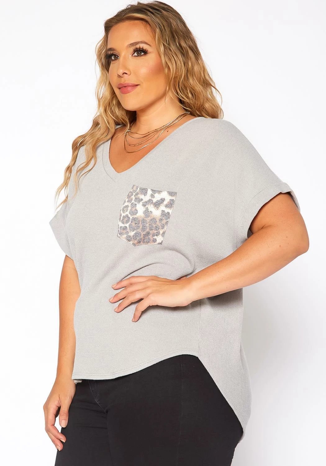 Basic plus size women’s t-shirt in v-neck style, short sleeves and leopard pocket hem contrast.