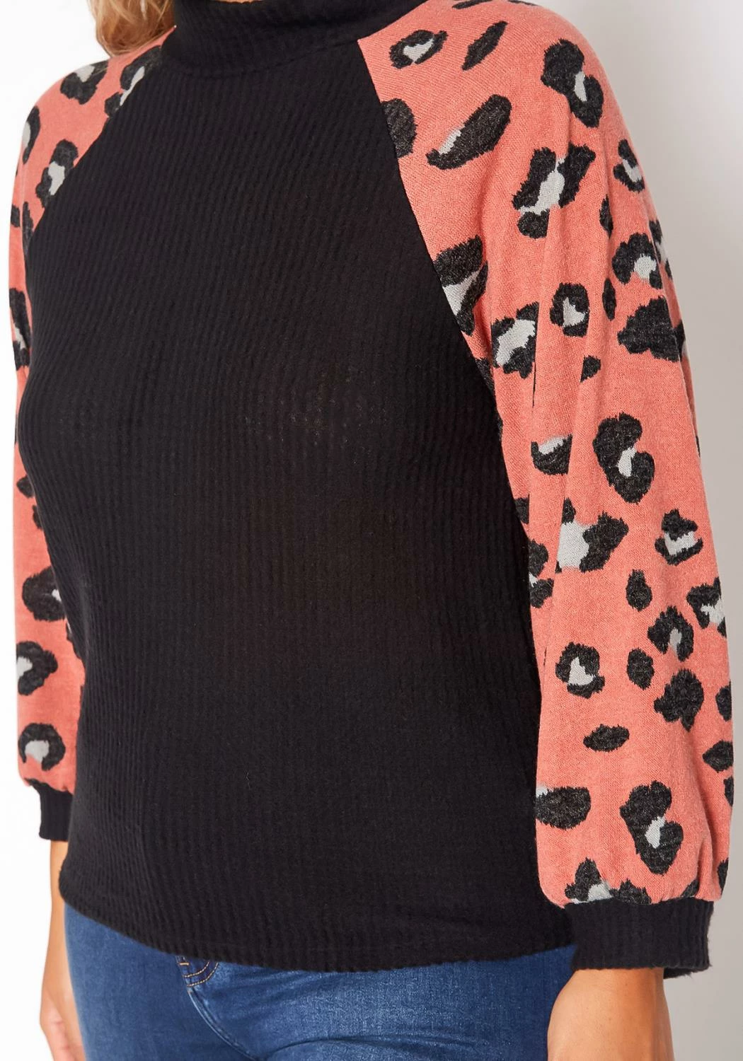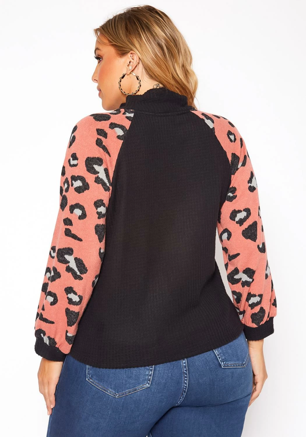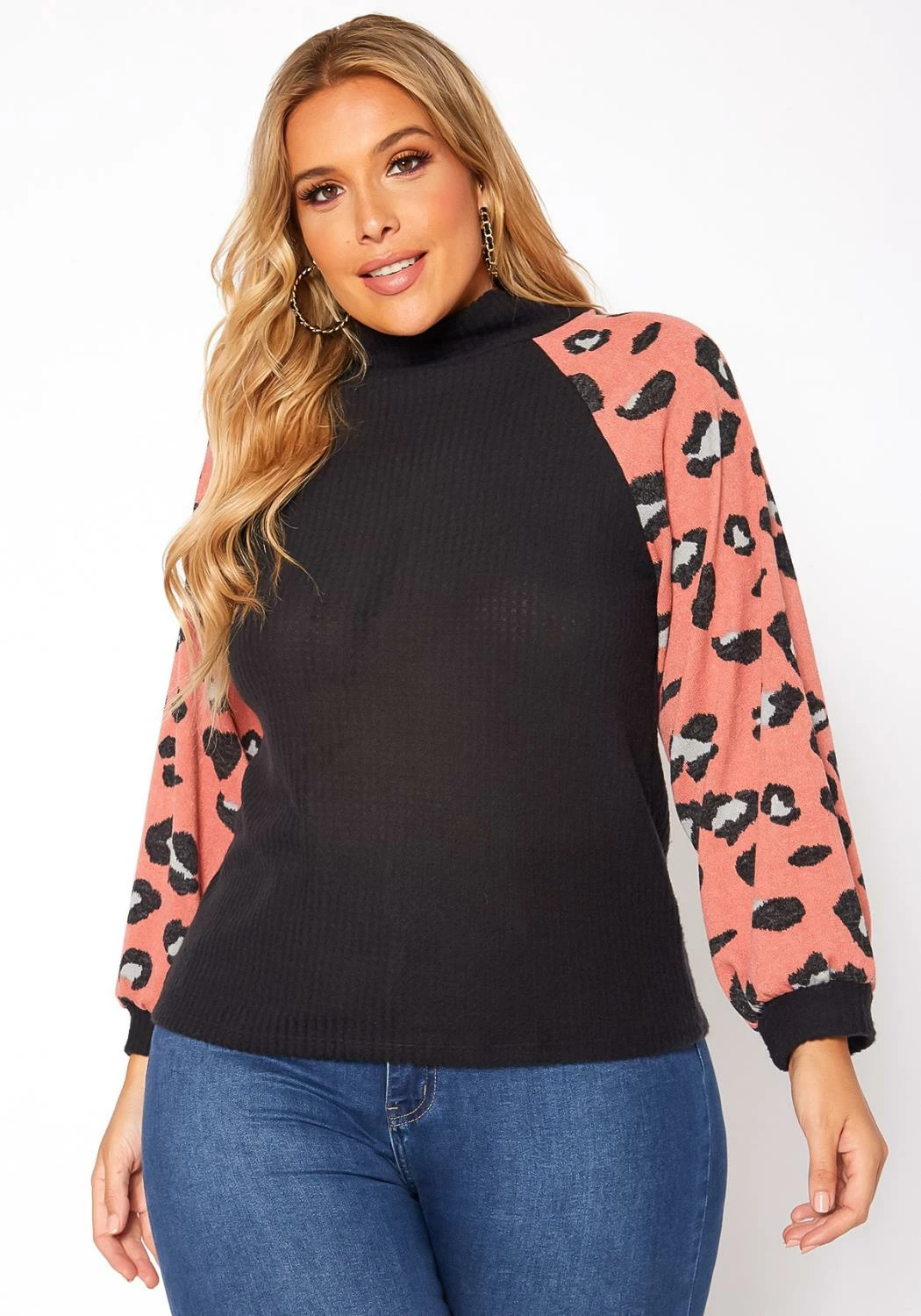 Cozy plus size women’s knit sweater in leopard print long sleeves, high neck style and waffle knit material.