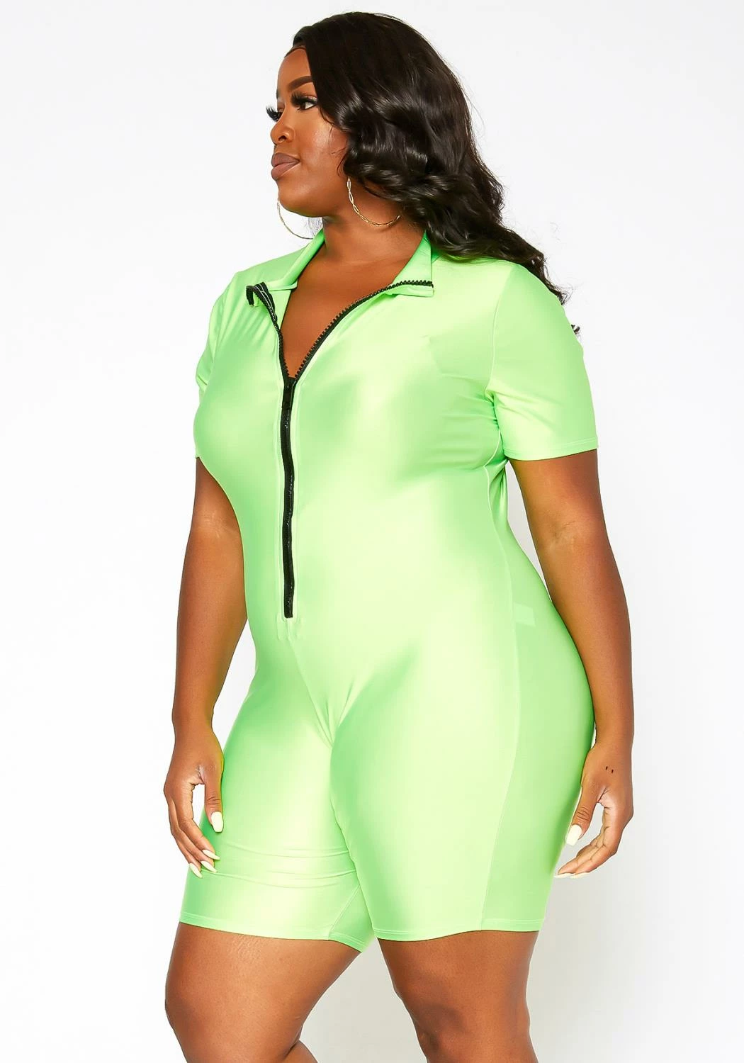 A summer favorite romper for plus size women! Features neon color, zip front closure, mock neck style and fitted short sleeves.