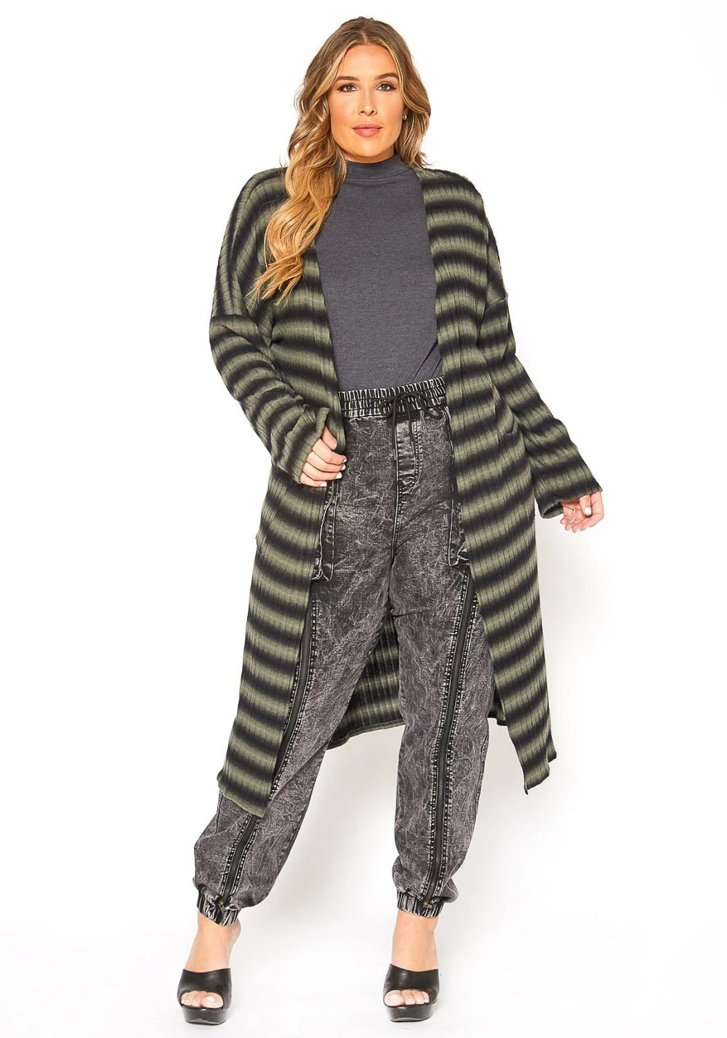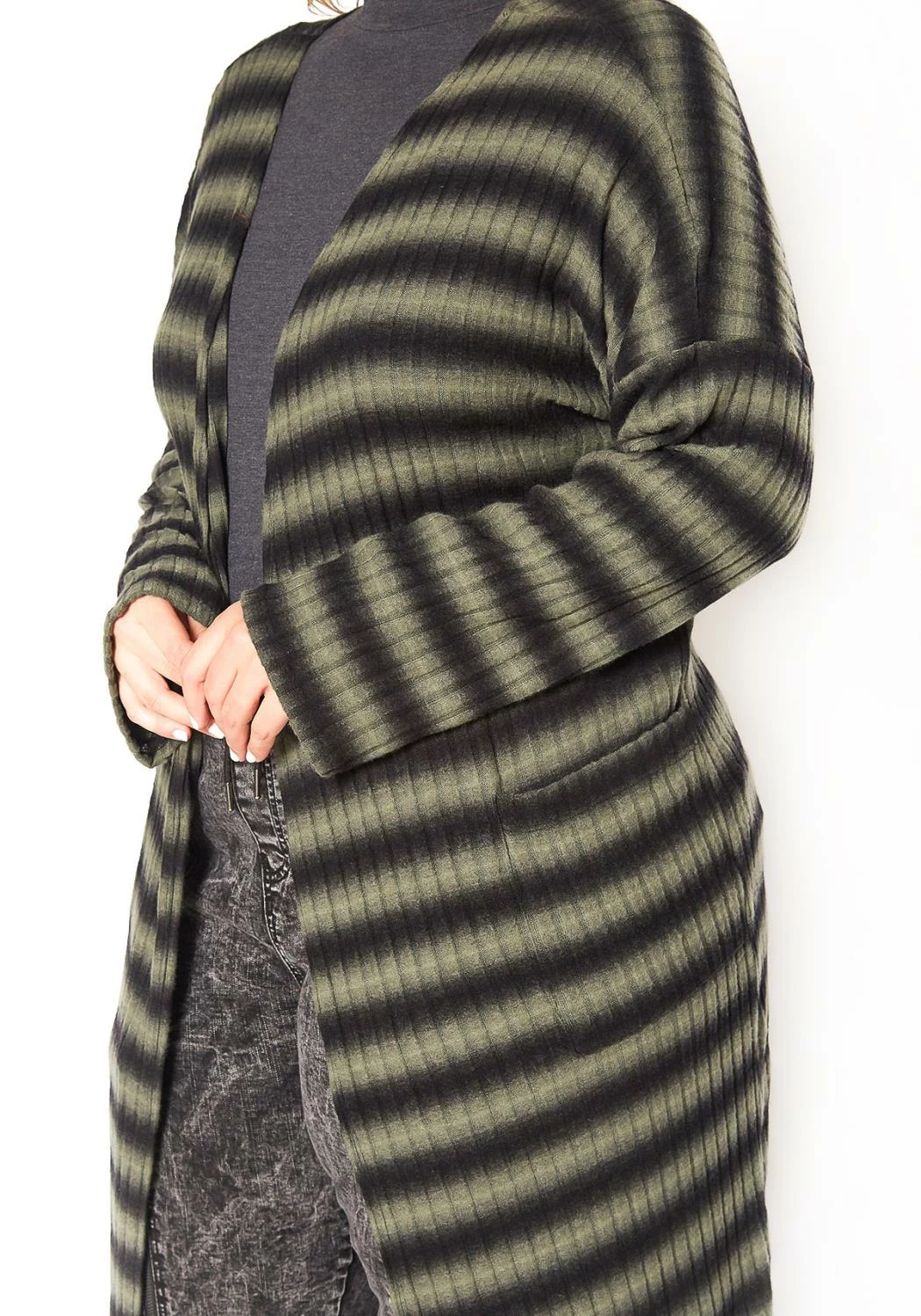 Plus size women’s striped knit cardigan in open front style, fitted long sleeves and longline knee length.