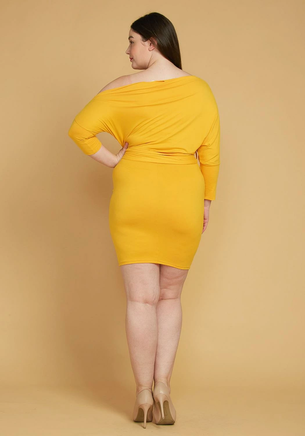 Cute one shoulder bodycon dress with batwing sleeves and tie waistbelt.