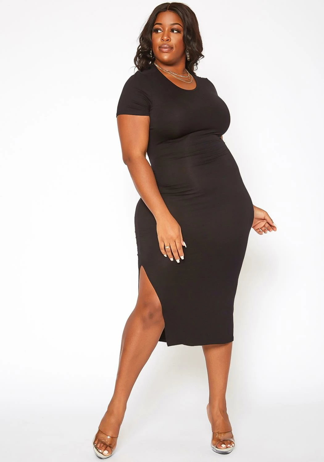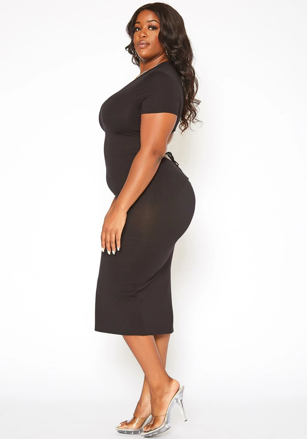 Upleveled basic plus size women’s midi dress with open back design, back tie closure, round neck style, short sleeves and bodycon fit.