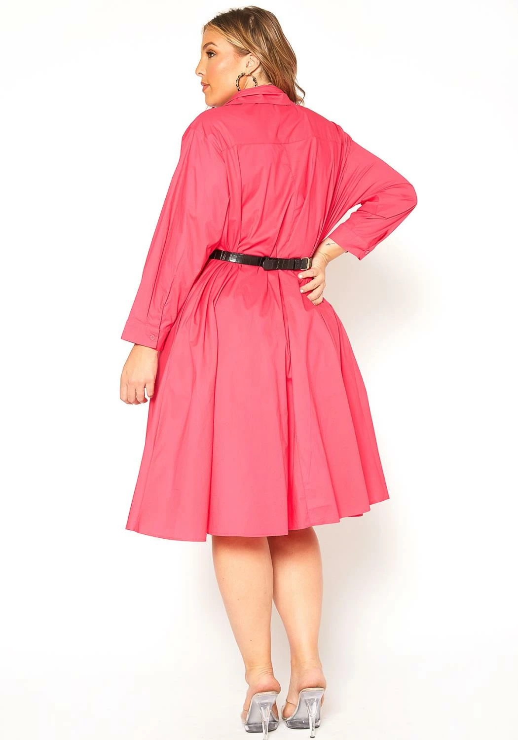 Plus size women’s oversized boyfriend look button up shirt dress with high low hem.