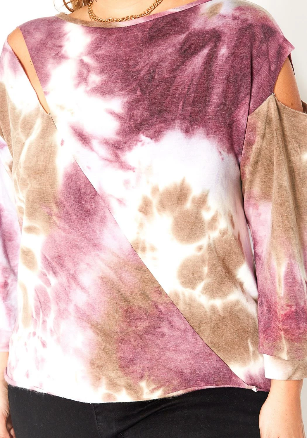 Trendy and fashionable plus size women’s crew neck top in pink tie dye design and slit hem details.