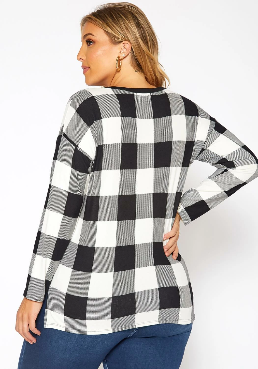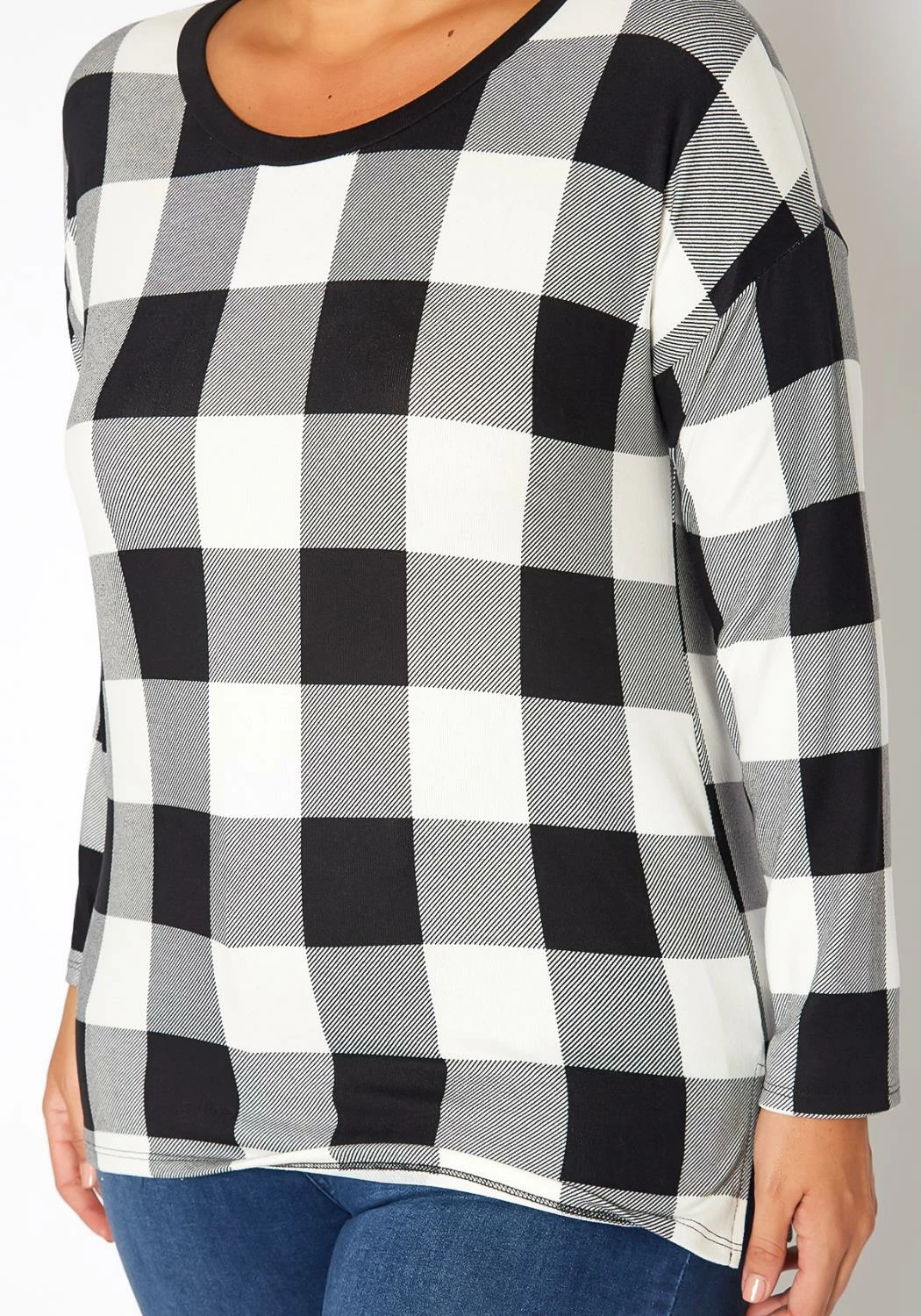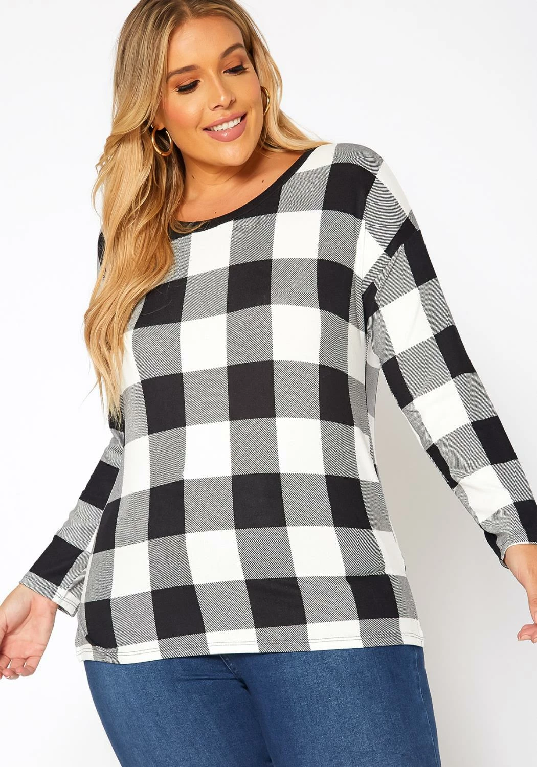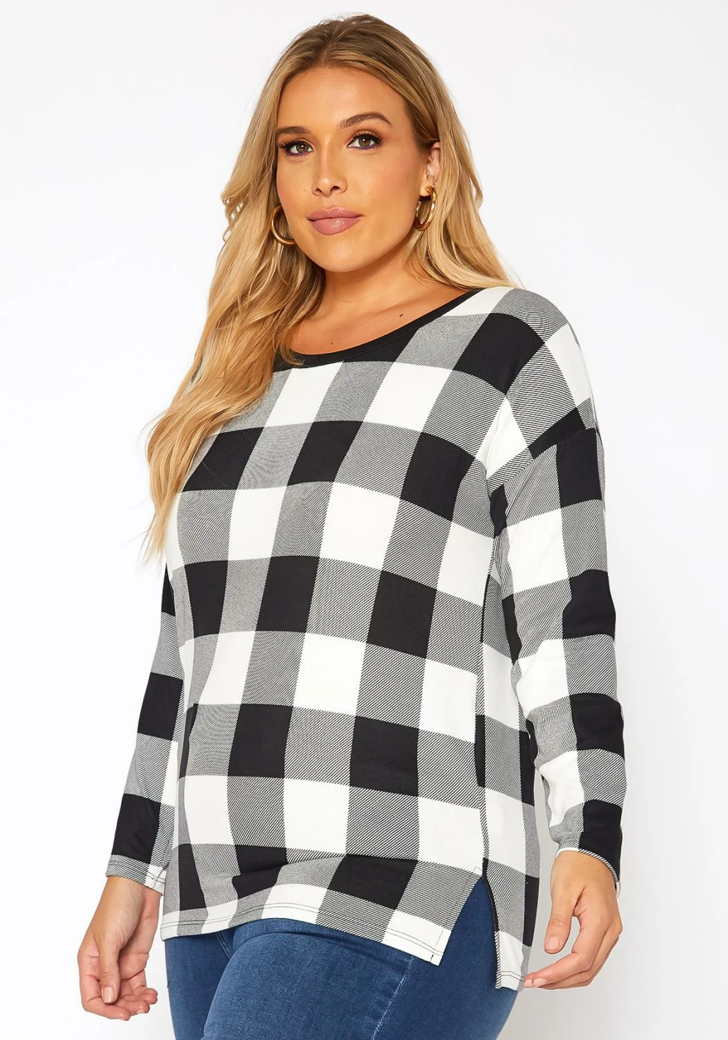 Plus size women’s essential long sleeve top in plaid print, casual crew neck style, slim fit and side slit hem design.