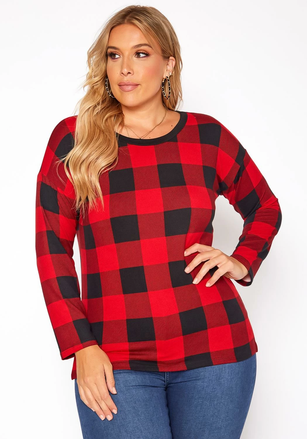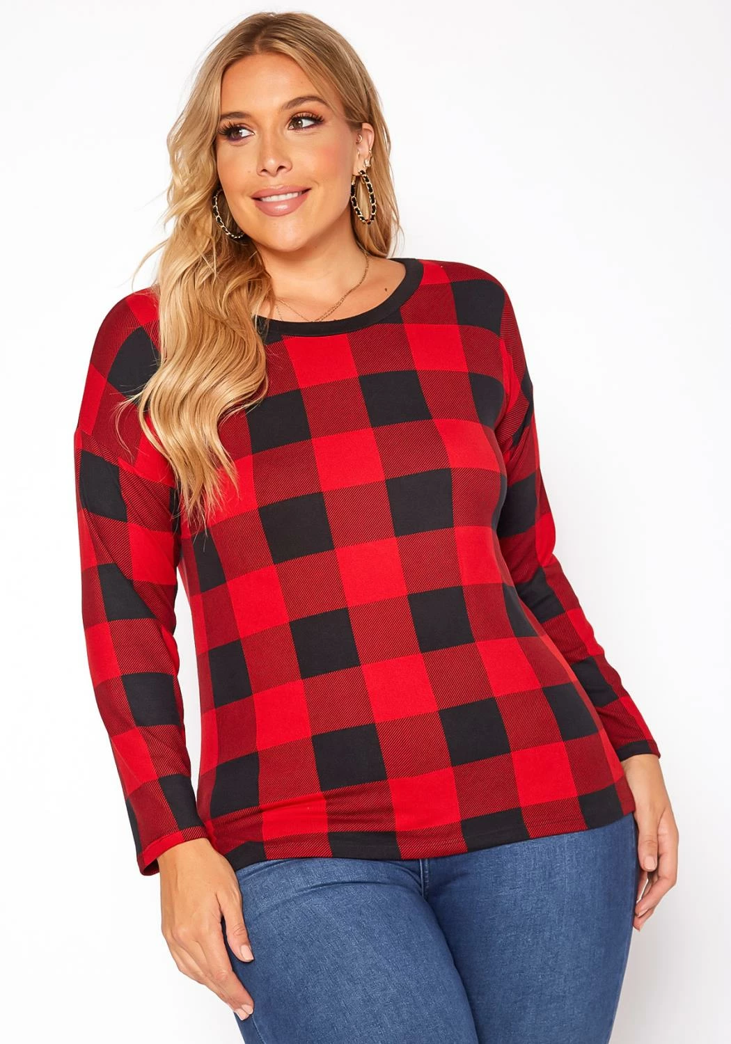 Plus size women’s essential long sleeve top in plaid print, casual crew neck style, slim fit and side slit hem design.
