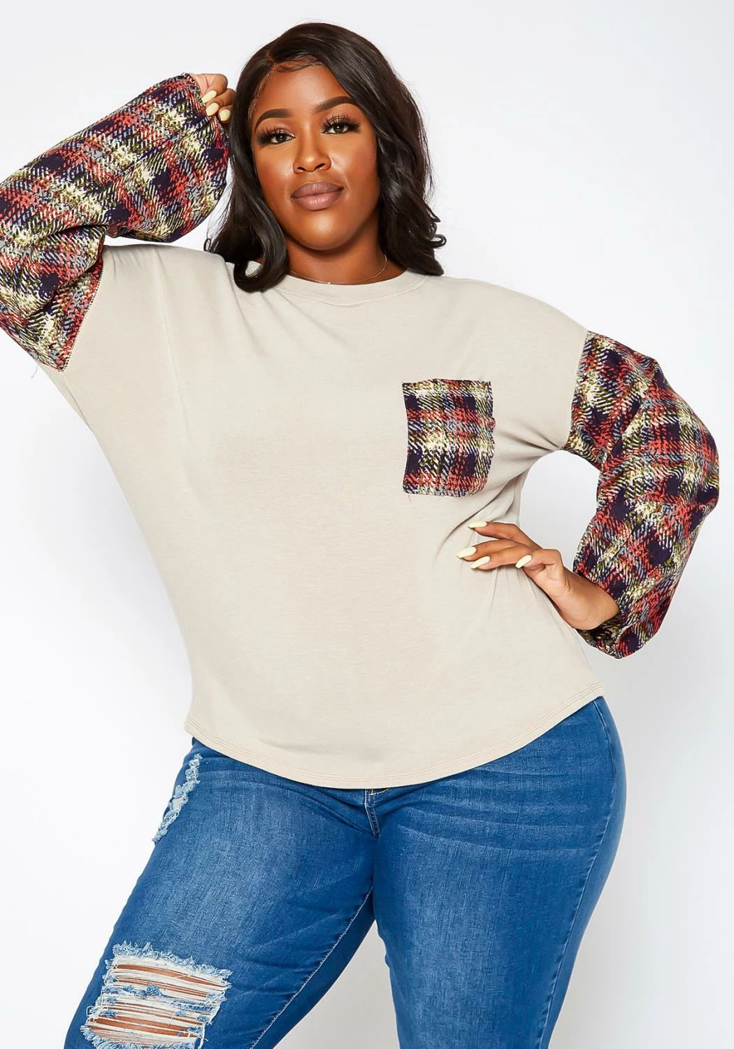 Casual and chic plus size women’s sweatshirt in plaid print contrast long sleeves and pocket hem, crew neck style and elastic wrist cuffs.
