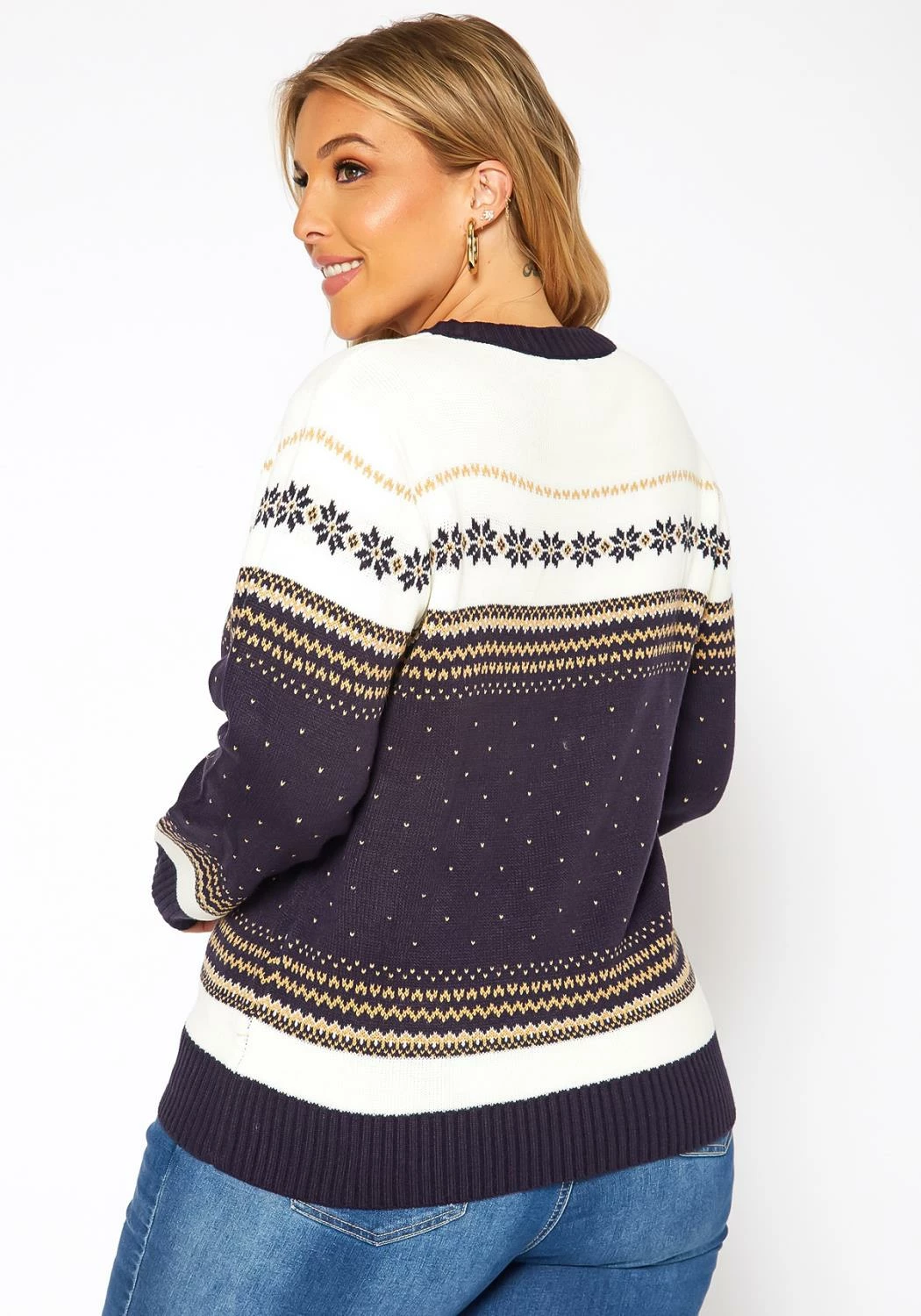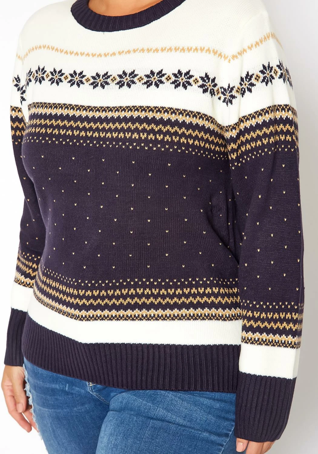 Winter starter cable knit sweater for plus size women with multi pattern, crew neck style and comfy long sleeves.