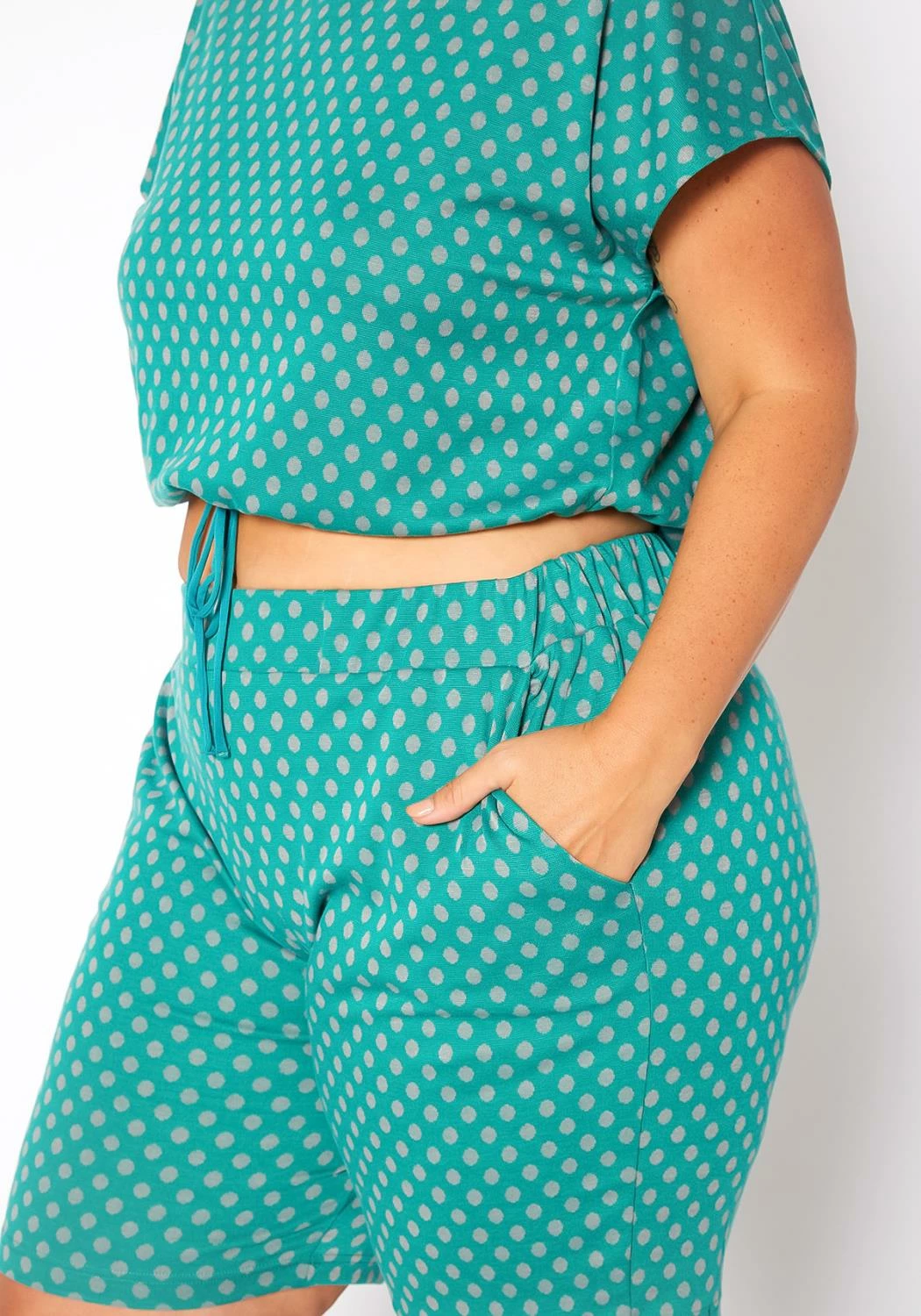 Comfy summer lounge set in polka dot print. Features short sleeve crop top with elastic waist hem and mid rise biker shorts with pocket hem.