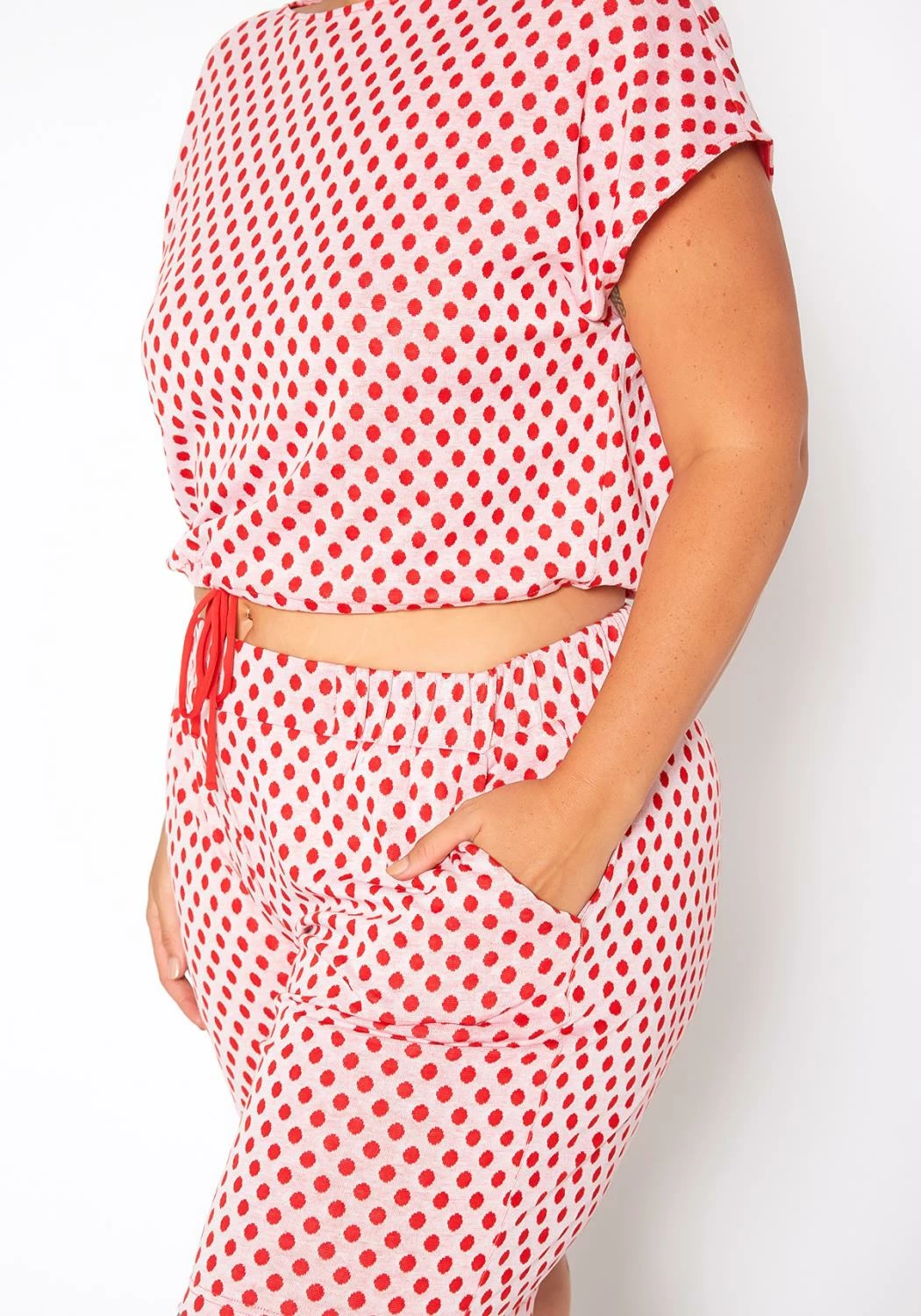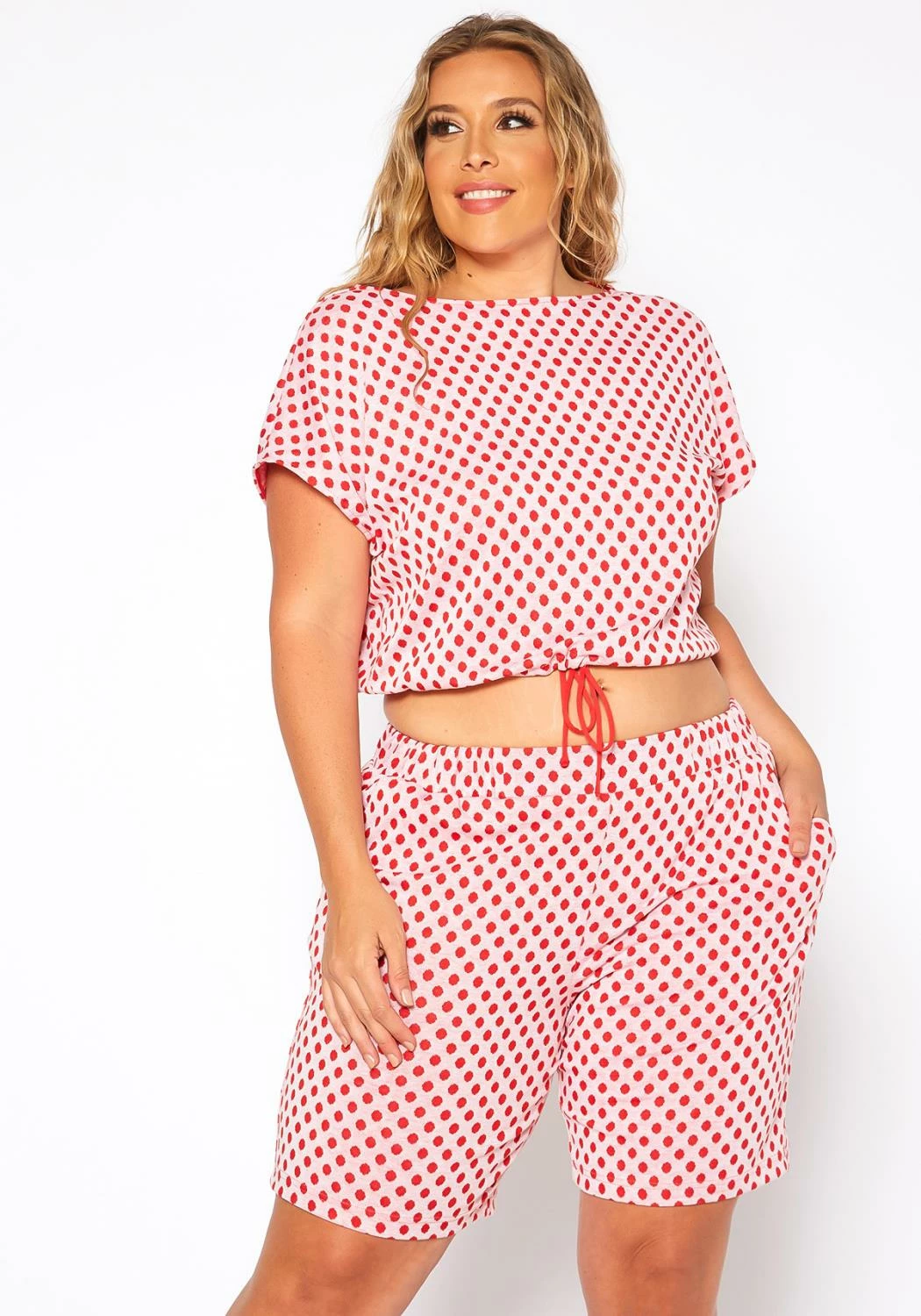 Comfy summer lounge set in polka dot print. Features short sleeve crop top with elastic waist hem and mid rise biker shorts with pocket hem.