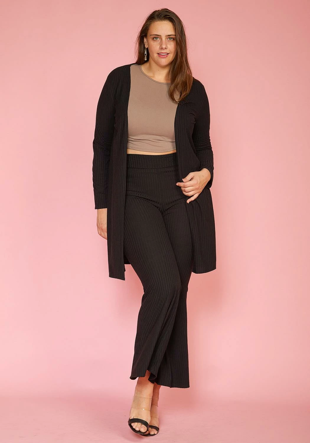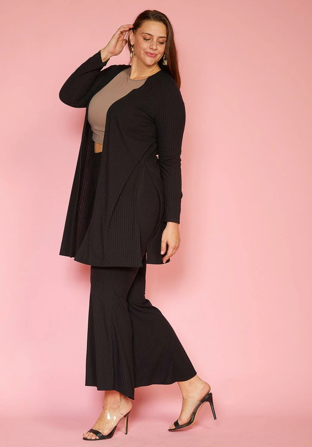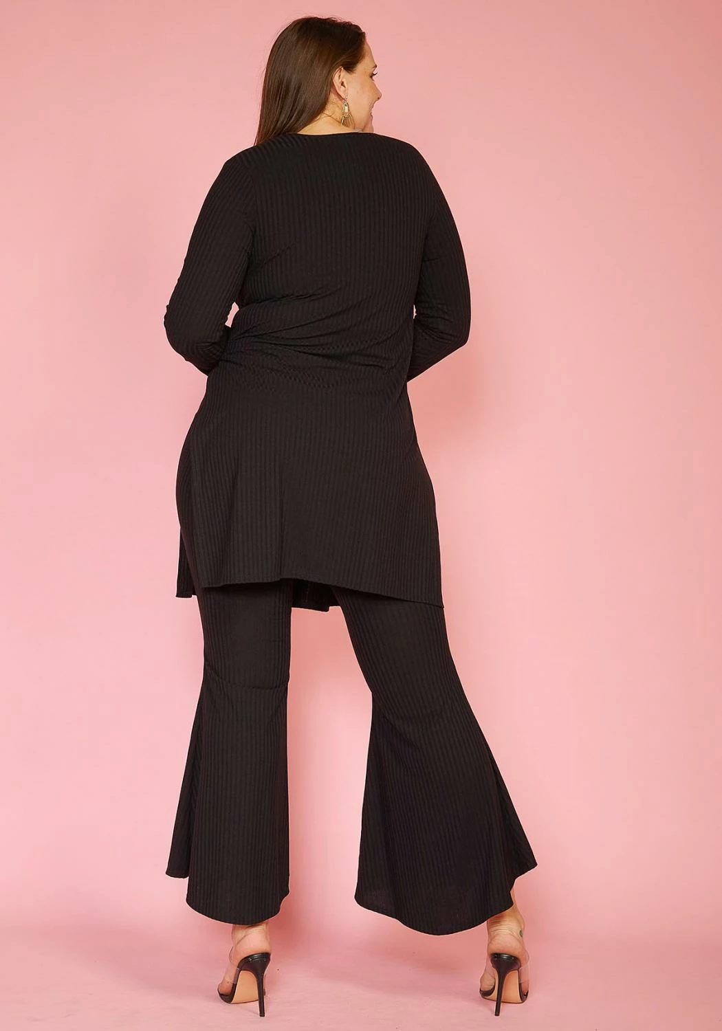 This set is a must-have for anyone looking for trendy plus-size options. The ribbed design is on-point, and the flare pants are so comfortable. I’ve received so many compliments while wearing it. The only downside is that the cardigan is a bit shorter than I expected, but it still looks great. Definitely worth the purchase!