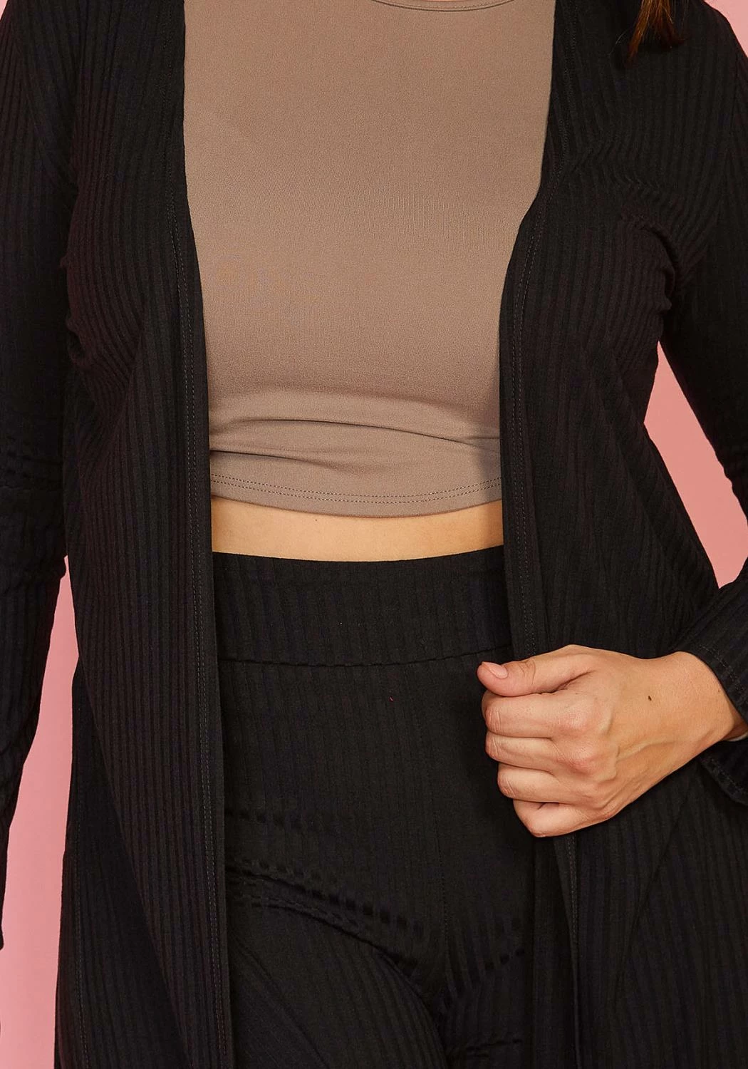 Open front cardigan and its matching high waist pants. Easily pair your favorite top with this set.