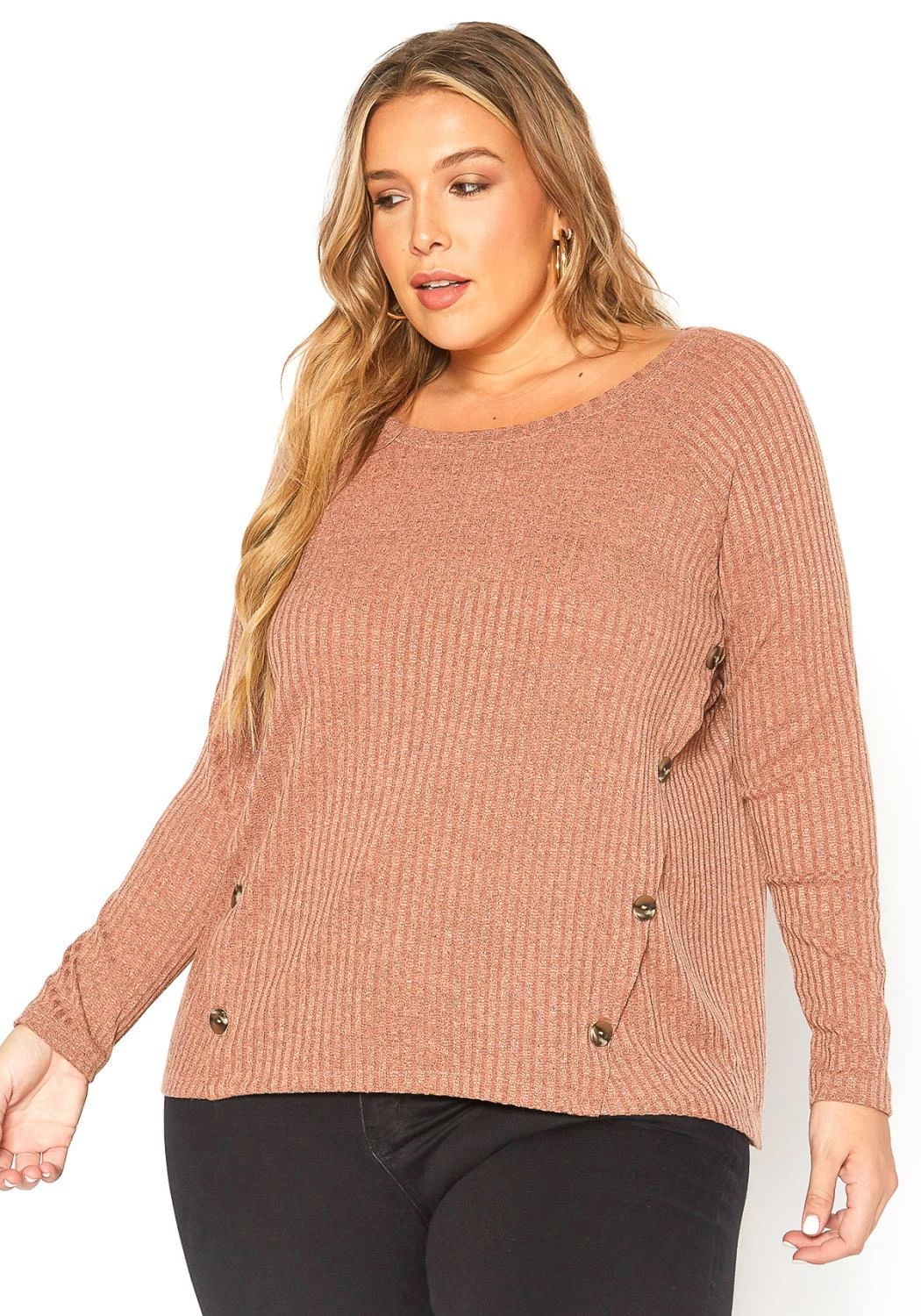Plus size women’s crewneck basic ribbed knit sweater top with side faux button accent.