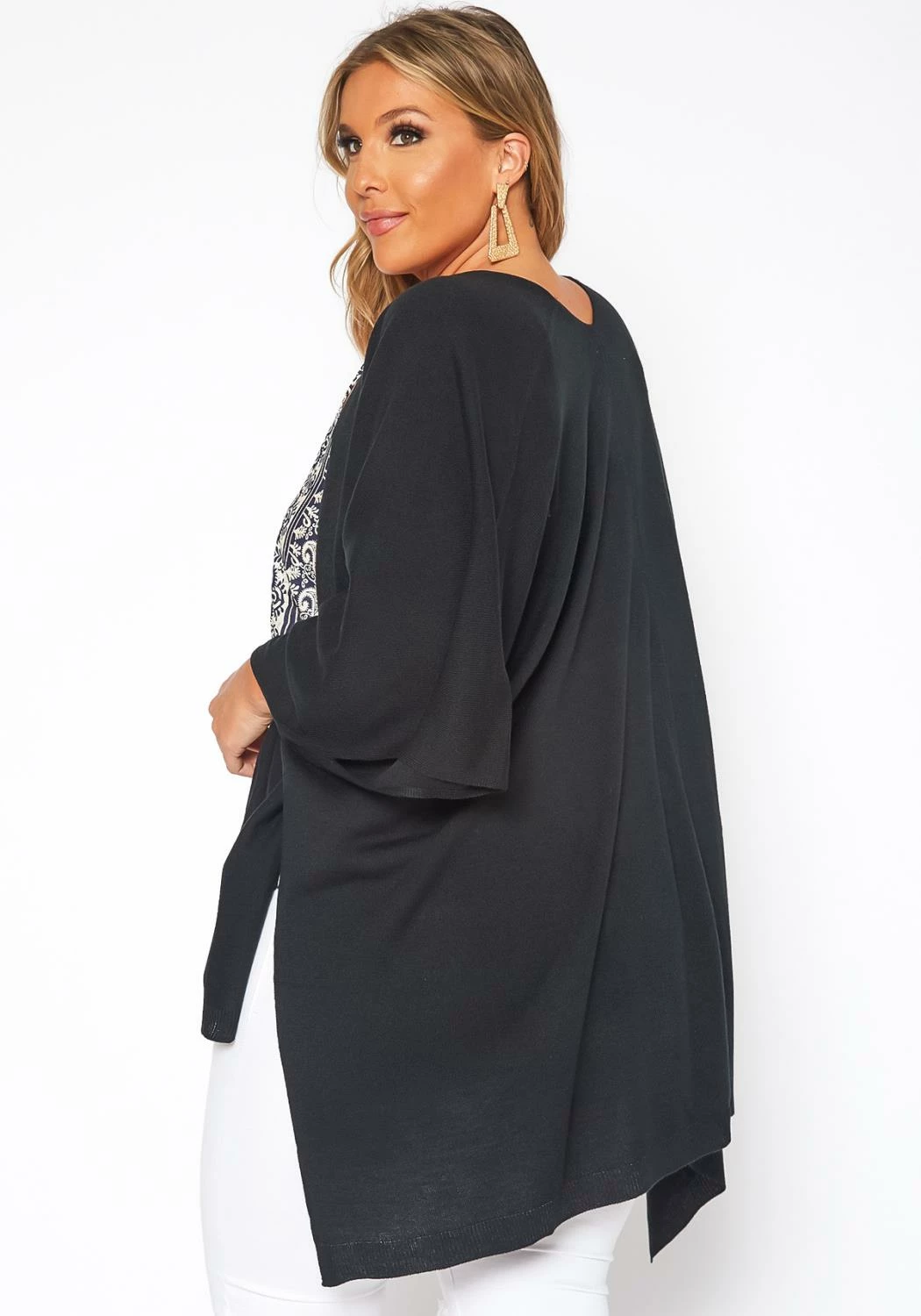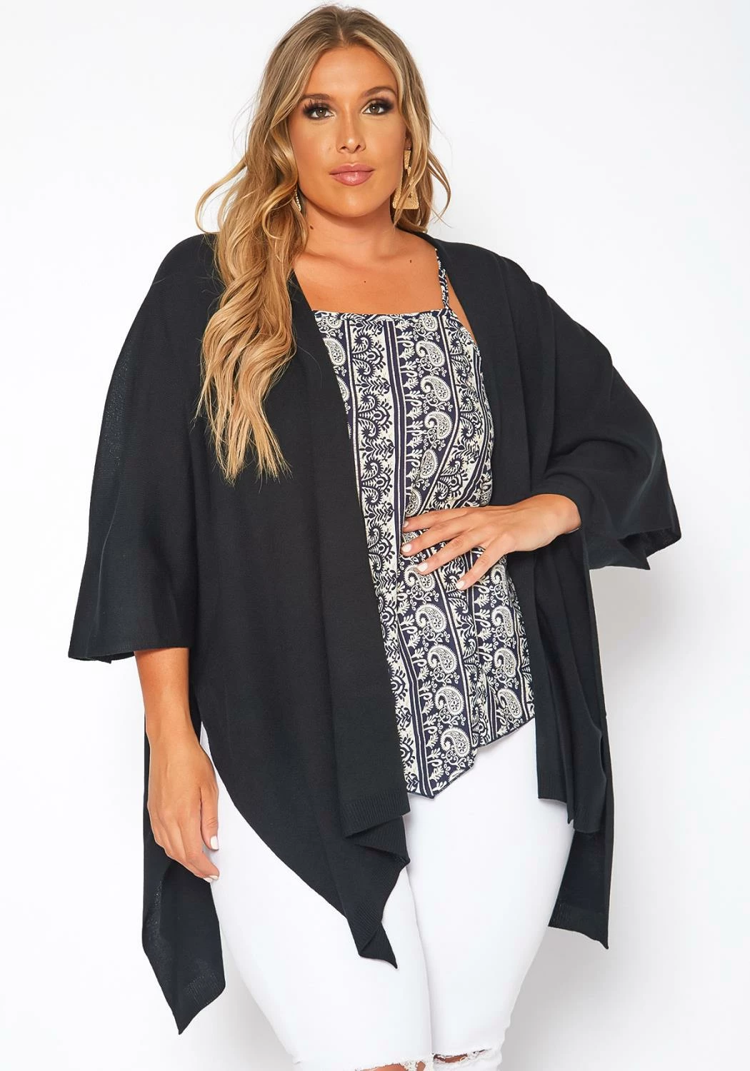Lightweight and warm kimono cardigan for plus size women in open front style, boxy design and slit hem ascent.
