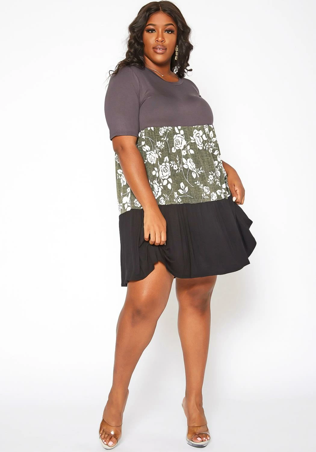 Simple plus size women’s mini dress in color block design, round neck style and fitted short sleeves.