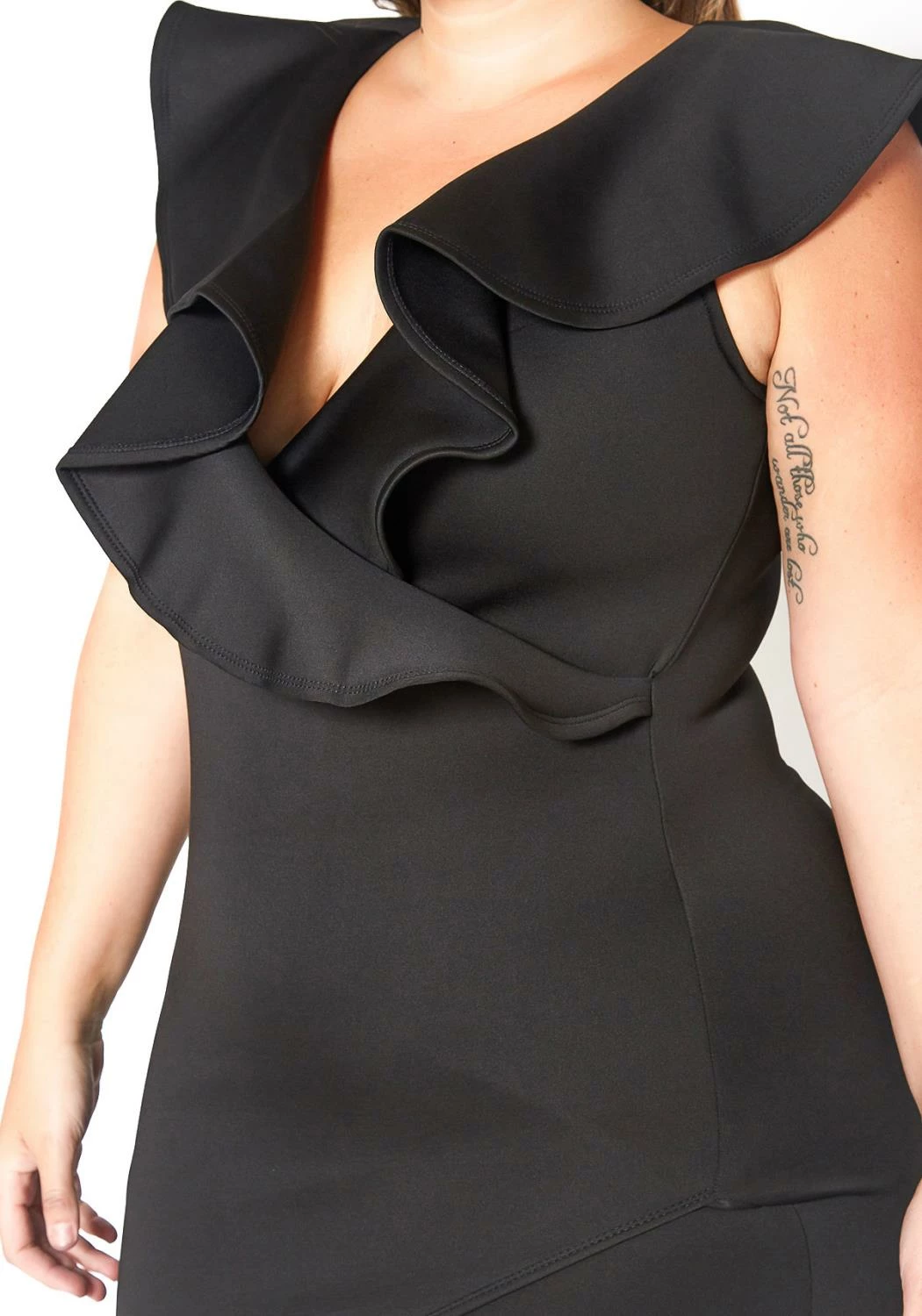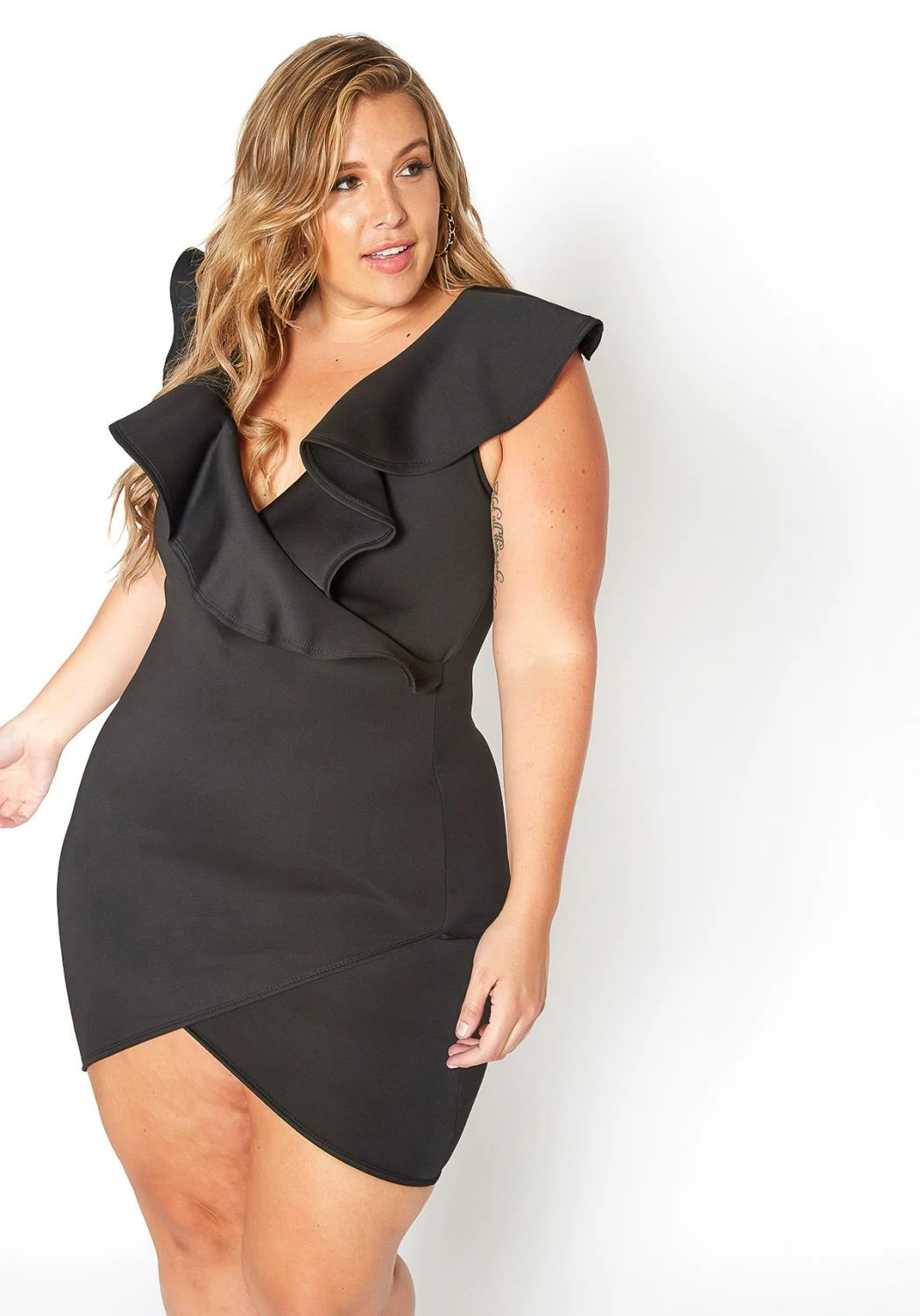 Asoph’s fancy special occasion mini black dress for plus size women which features a ruffle overlay v-neck and asymmetric design front end.