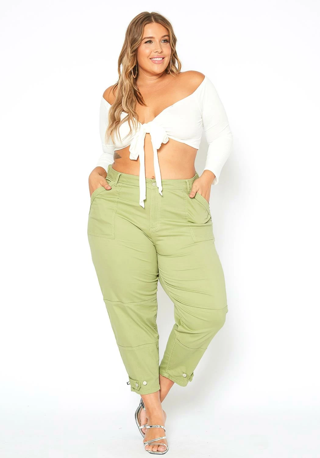 Fresh and trendy plus size women’s utility cargo pants in lovely sage green color plus features belt loop holes, pockets and button ankle ascent.