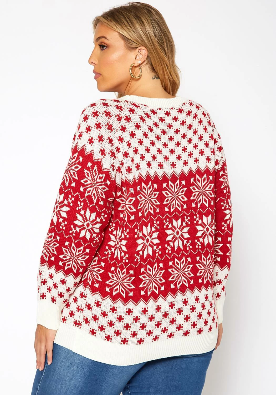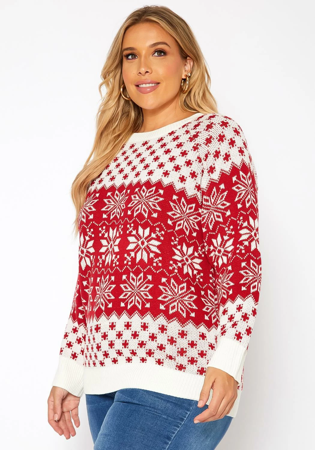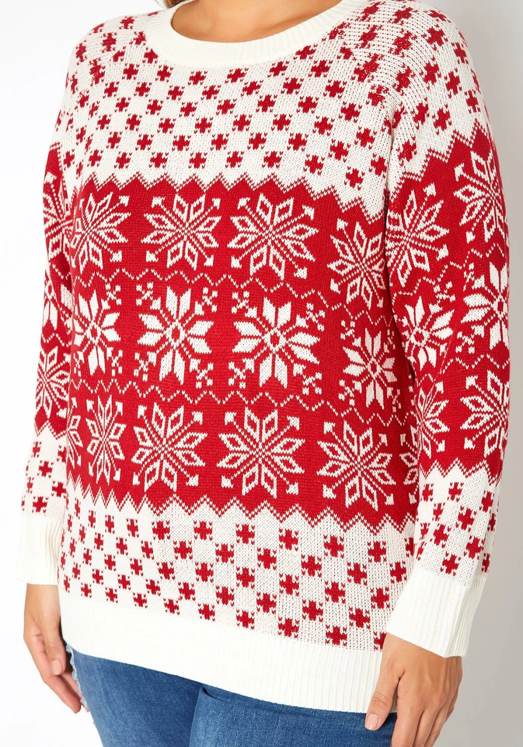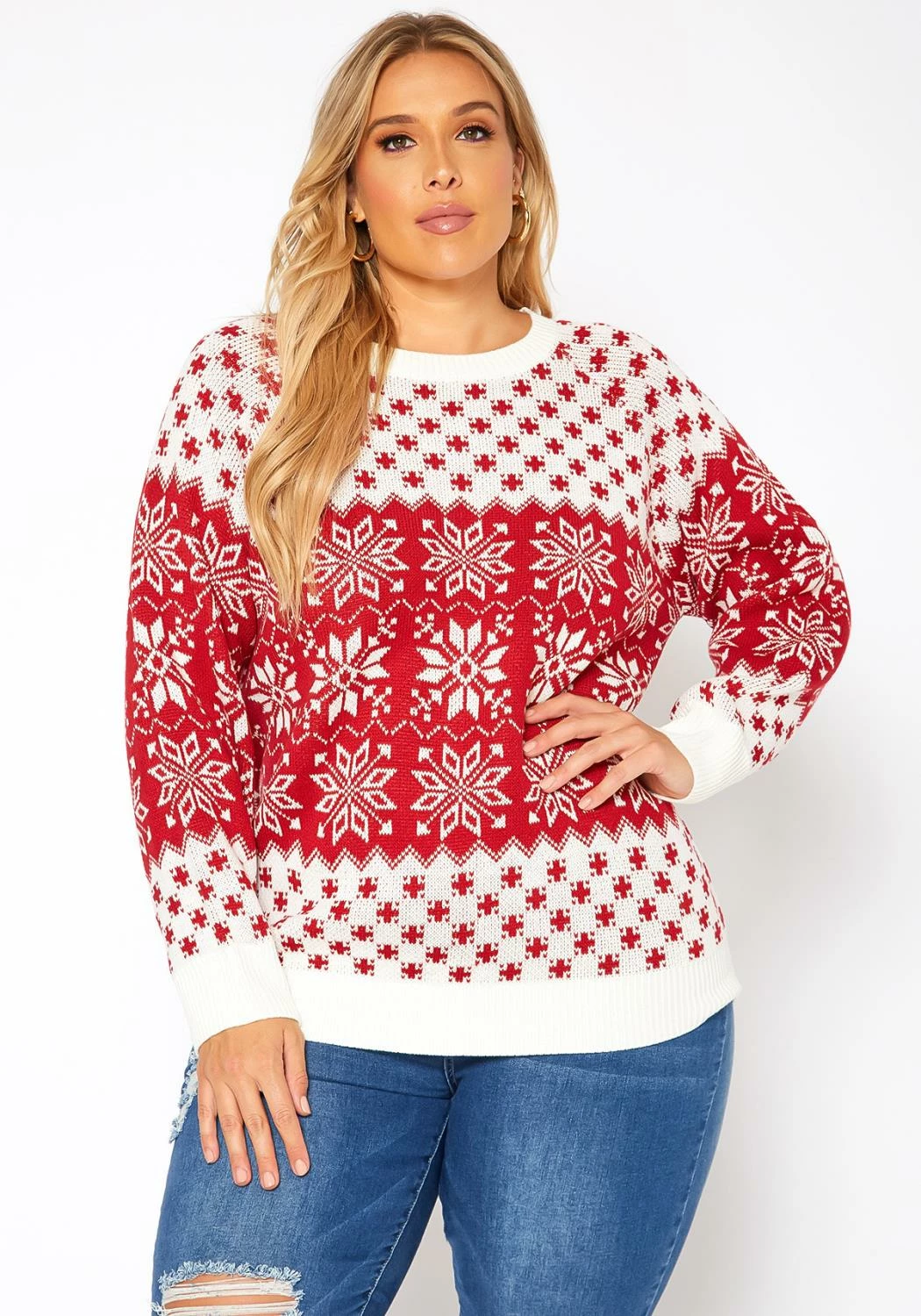 Winter starter cable knit sweater for plus size women with multi pattern, crew neck style and comfy long sleeves.