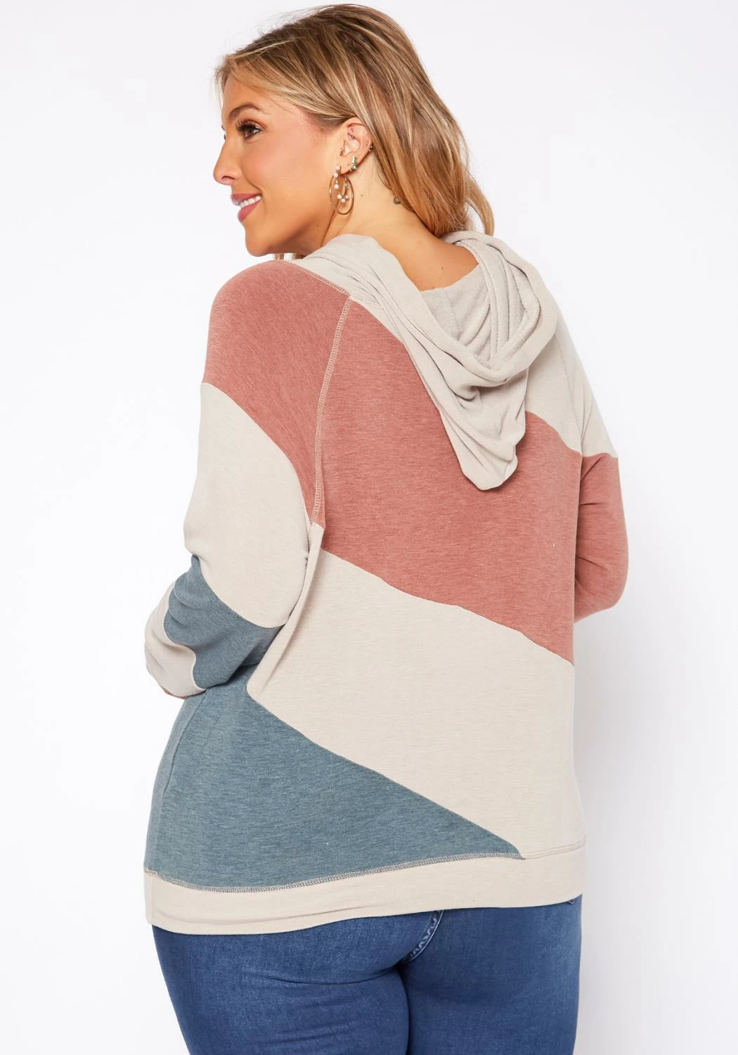 Casual plus size women’s sweater in color splice design, relaxed fit, soft-lightweight material and hooded style.