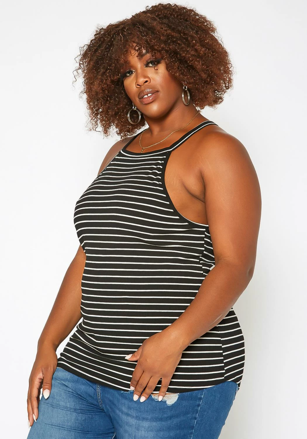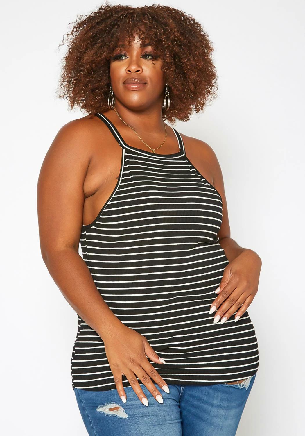 Plus size women’s basic cami top in striped print, ribbed material and slim fitting.
